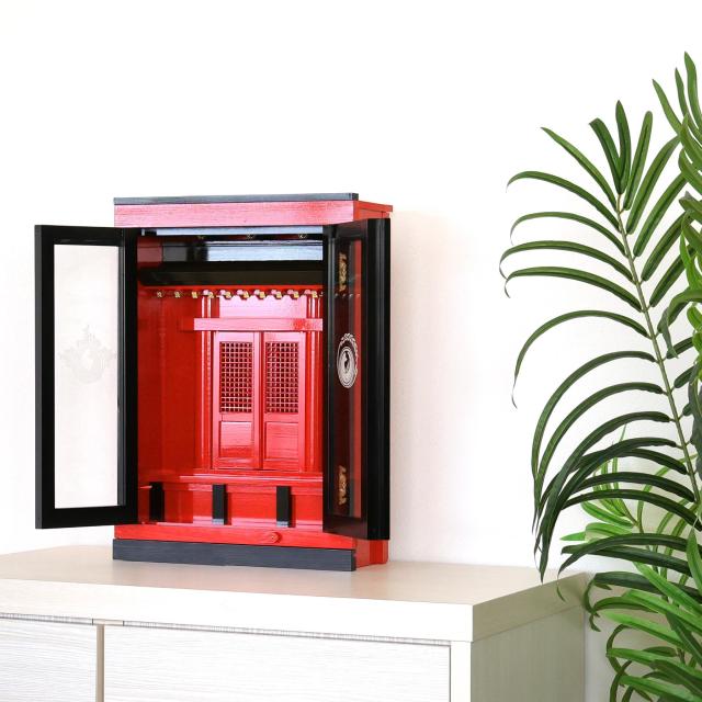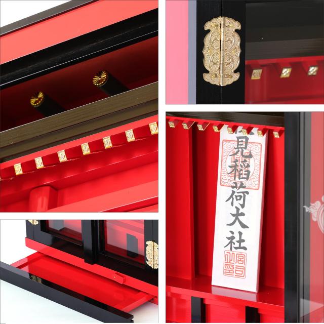 岐阜県・東濃地域の桧材を使用して造られています。そして職人による、一体ごとの手塗り作業。見た目の華やかさとともに、細部までこだわりの木工技術が見え隠れする、上品さ。お供えや神具が置ける、膳引き(引き出し)も備わっています。
