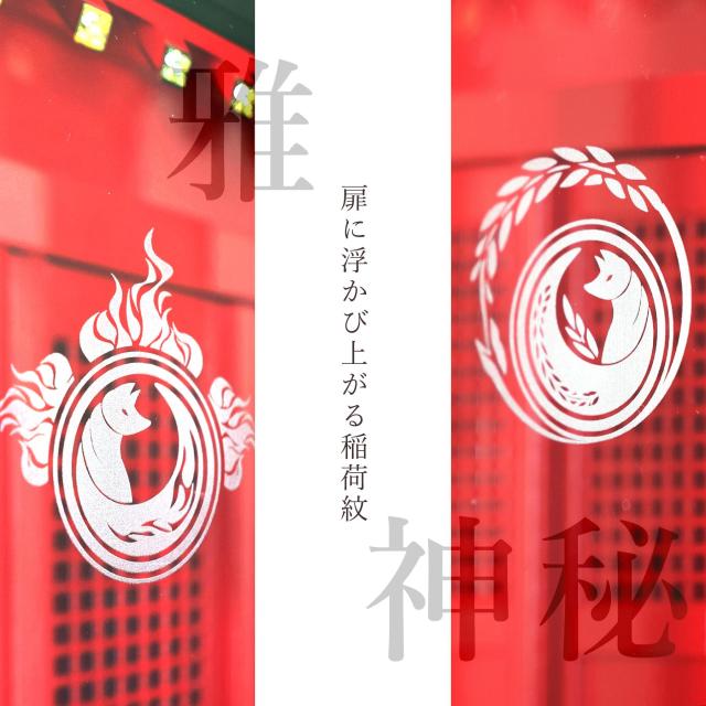 稲荷宮で授かった御札を、静かに、そして美しく納める専用の神棚。扉に浮かび上がる「稲荷紋」は雅やかさと神秘、結界が引かれた威厳の空間を。ガラス越しに差す光は内陣の美しさを映し出し、手を合わせるひと時に、華を添えるお社となっています