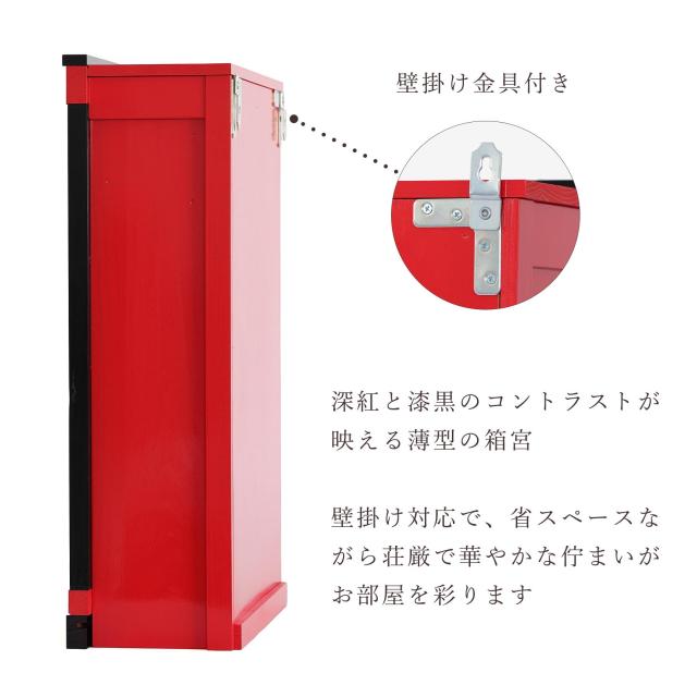 省スペースながら存在感は際立ち、壁掛けもできるため、お部屋の中でも自由なレイアウトが可能です。棚置きしても、その空間一帯に格式を添える、神棚。現代の暮らしのひと時に、古き良き「願い」の習慣を自然に取り入れることができます。