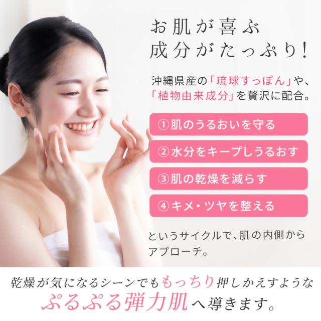 成分:水、グリセリン、BG、スッポンエキス、ヒアルロン酸Na、加水分解コラーゲン、シャクヤク根エキス、シイクワシャー果皮エキス、フォリオタミクロスポラ多糖体、オウゴン根エキス、酒粕エキス、セイヨウノコギリソウエキス、トウキ根エキス、マンニトール、水溶性コラーゲン、ヒト遺伝子組換オリゴペプチド-1、PVP、フラーレン、ハトムギ種子エキス、α-グルカン、グルコシルセラミド、PCA亜鉛、マルトシルシクロデキストリン、シクロデキストリン、ジマルトシルシクロデキストリン、マルトース、ブドウ葉/種子/皮エキス、レスベラトロール、パルミチン酸レチノール、コーン油、BHT、BHA、ヒドロキシアセトフェノン、アルギン酸Na、キサンタンガム、クエン酸、クエン酸Na、ポリソルベート80、フェノキシエタノール