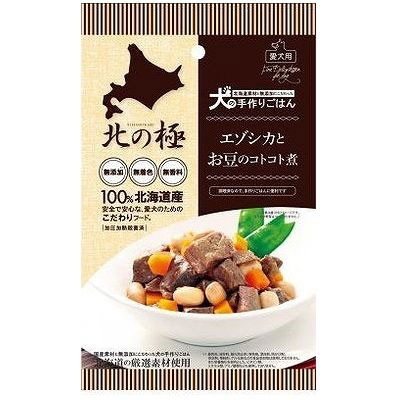 エゾシカとお豆のコトコト煮は100%北海道産。ヘルシーなエゾシカ肉を、大豆と人参と一緒に、丁寧にコトコト煮込みました。[素材にこだわった商品]『北の極』が使用するエゾシカ肉は野生肉の臭みを消す為に、3日間血抜きをしています。新鮮なエゾシカ肉を人間が食べられるレベルで丁寧に処理をしまた、余分な添加物は一切入れずに作っております。残念ながらペット用に使われているお肉は血抜きを十分しないお肉が多く使われているのが現状です。お肉は加熱後、レトルト加工しておりますのでそのまま与えられ、旅行やお預かりの際にも便利です。