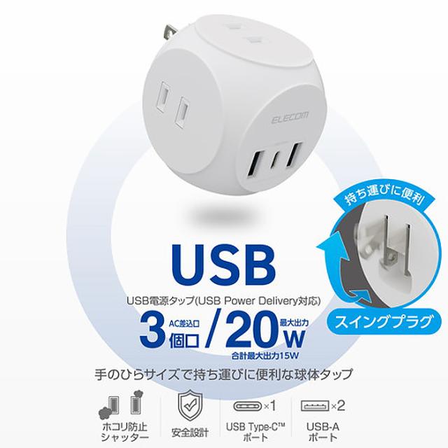 電源タップ USB付き タップ 直挿し (コンセント3口 Type-C×1 USB-A×2) 球体型 ほこり防止シャッター ホワイト