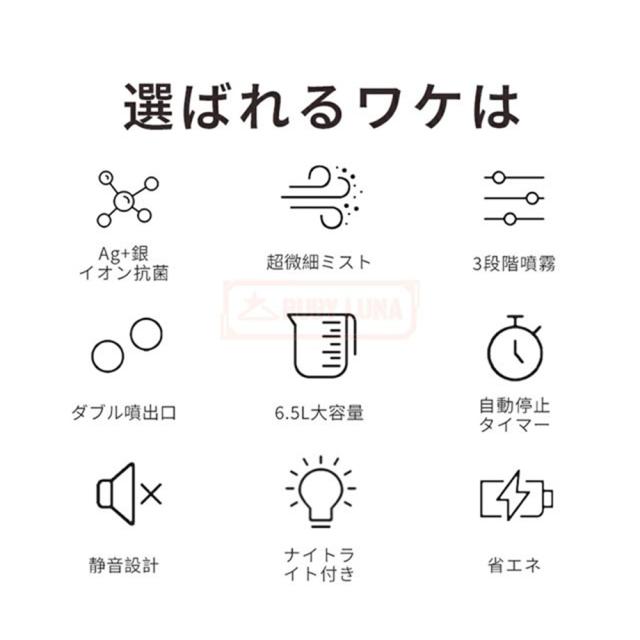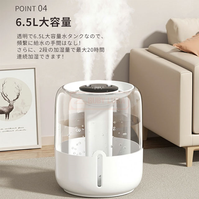 | 6.5L大容量で一晩中ずっと潤う | ◆1回の満タン給水で長時間加湿器できるから、たびたび給水の必要がありません。 |