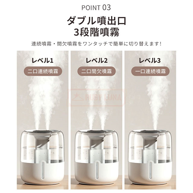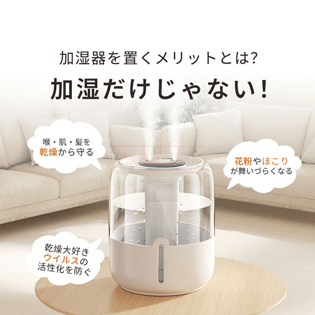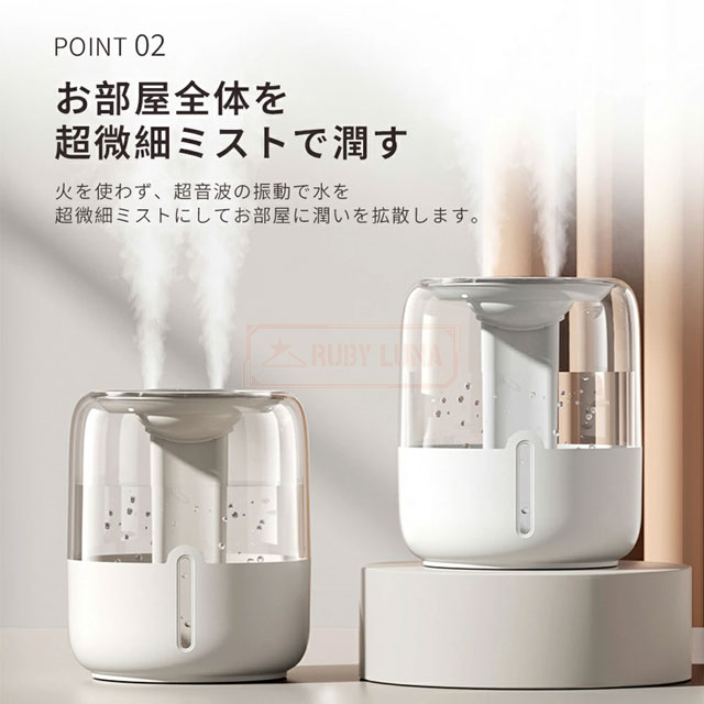 | ダブルミスト噴射口、効率的に加湿できる | ◆2つのミスト噴霧口が細かいミストで素早くお部屋をうるおす、水が積もることがない超音波方式を採用しています。 |