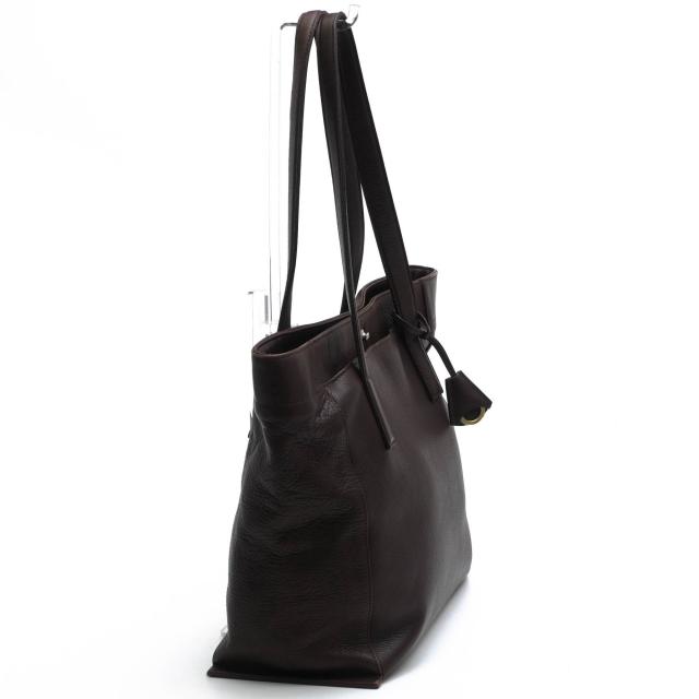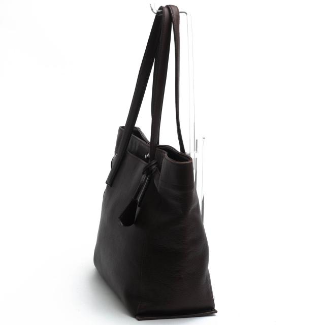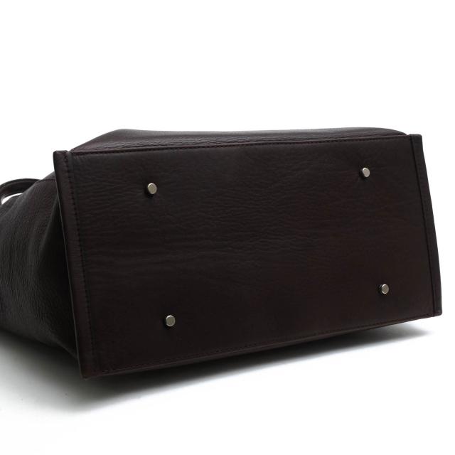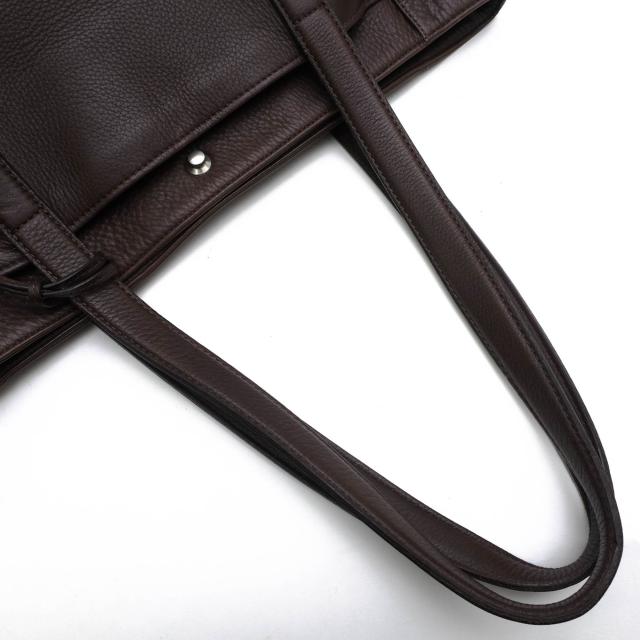 上質なシュリンクレザーにドイツホック金具を合わせたシンプルで上質なトートバッグ。染色工程後に熱を加えて縮めることで、自然な風合いと独特のエレガントな趣を持つ表面のシワが特徴です。ドイツホックと呼ばれる丸みのある留め具がさり気なくオシャレ。ハンドルは肩掛けも手持ちもしやすい長さに設計。前面にはあおりポケットがあり、メインコンパートメント内には合計3つのポケットが備わっているため、小物の整理が容易です。底鋲が付いているので、置いた際の安定感も抜群です。