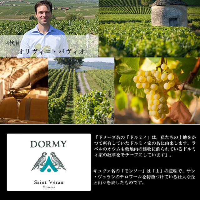【マコン村に1930年より続くぶどう栽培家で、長らくぶどうを販売していましたが、2014年に継承した4代目オリヴィエ・パヴィオが2021年にドメーヌを設立して自社ビン詰めを開始しました。「ドメーヌ名の「ドルミィ」は、私たちの土地をかつて所有していたドルミィ家の名に由来します。ドルミィ家はフランソワ1世からルイ14世までフランス国王の顧問を務め、ブルゴーニュおよびマコネの発展のために多大な貢献をしました。彼らの歴史を語り継ぐためにドメーヌ名に採用しました。ラベルのオウムも敷地内の建物に飾られているドルミィ家の紋章をモチーフにしています」。