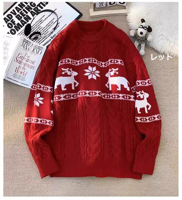 セーター ニットセーター ヘラジカ ニット 男女兼用 メンズ クリスマス Xmas Christmas 長袖 トップス オーバーセーター 柔らかい ふわふわ ゆったり 秋冬 おしゃれ カジュアル 可愛い 暖かい ペアルック黒 白 赤