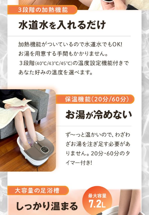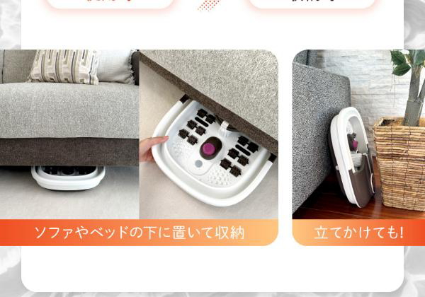 お家で簡単に足湯が楽しめる「折り畳み式フットバス ふっとひと息」。全身浴に比べて心臓や内臓への負担が少なく、リラックスしながら全身温めることができる足湯です。加熱機能付き!毎回お湯を用意する手間がありません。さらに3段階(40℃/43℃/45℃)の温度調節機能付き!あなた好みの温度を選べます。保温機能(20分/60分)付き!ず〜っと温かいのでわざわざお湯を注ぎ足す必要なしです。バブル機能付きで気泡口からジェットバスのようなバブルが出てやさしく足をほぐします。底面に取り外し可能なマッサージローラー付きで足湯しながら足裏のマッサージもできて極楽体験できます。空焚き防止機能付き!なので安心安全です。折りたたみ式で使わないときはコンパクトにたたんでソファやベッドの下にスッキリ収納できます。