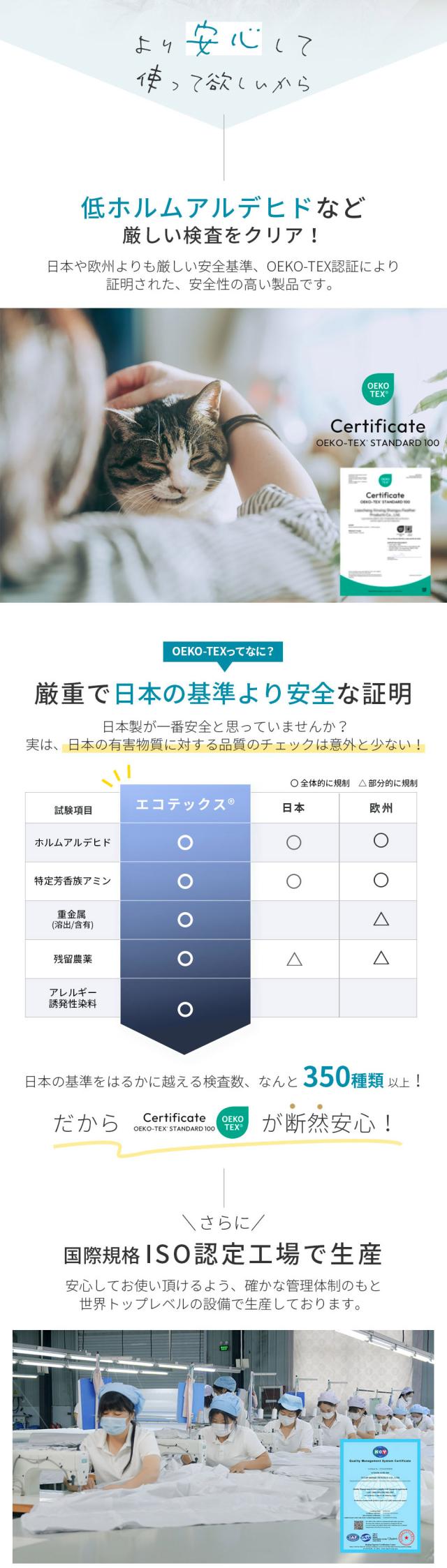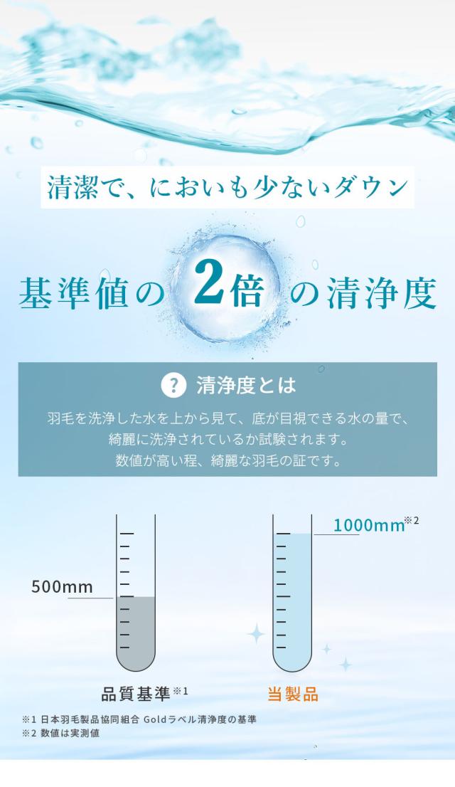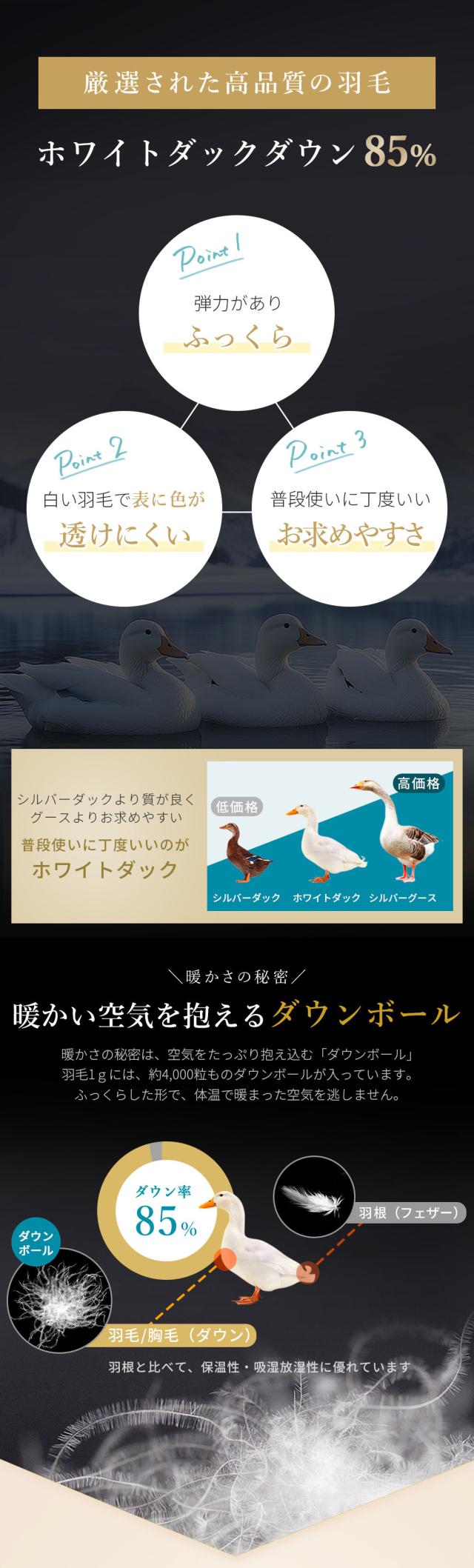 ホワイトダック ダウン85%、フェザー15% / 生地:ポリエステル85%、コットン15%