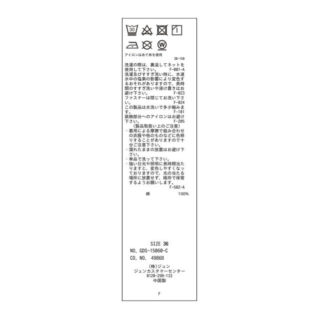 ■お手入:洗濯機|漂白不可|タンブル乾燥不可|自然乾燥|アイロン仕上げ可|ドライ不可|ウエットクリーニング可