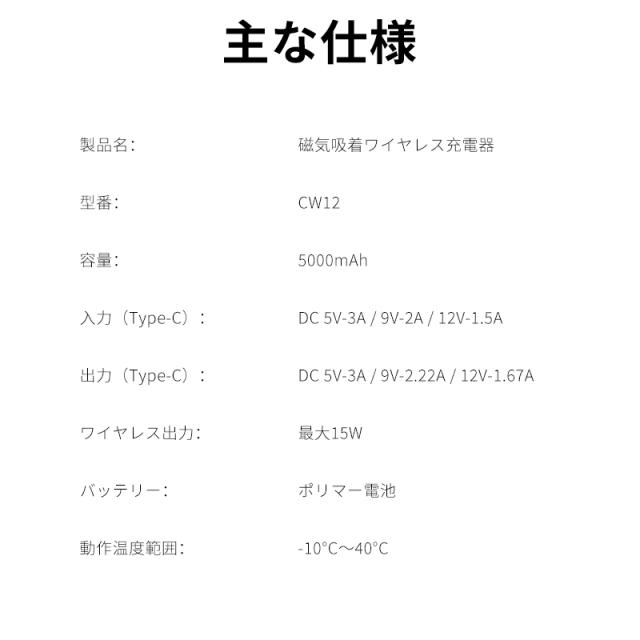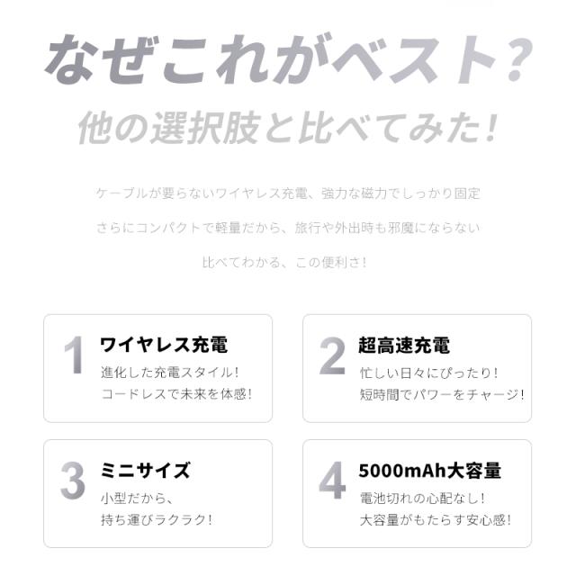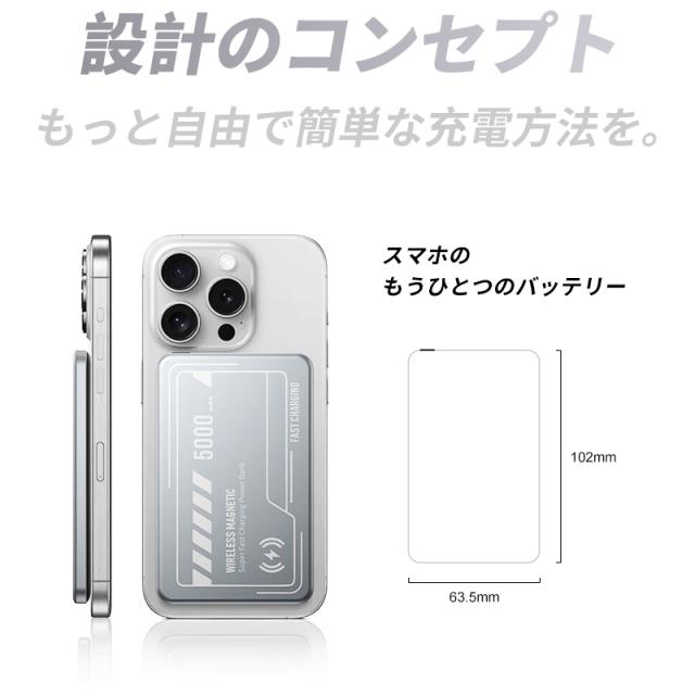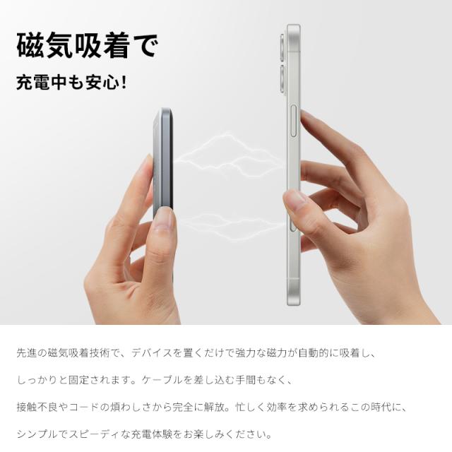 マグネットでスマホにくっつくMagSafe対応モバイルバッテリー。iPhone 16に磁力で吸着し、MagSafeテクノロジーを最大限に活用しています。スリムでポータブルながら、5000mAhの大容量。外出先で、カメラをブロックせずに、すばやく簡単に急速充電が行えるため、大事な瞬間を逃したり、世界とのつながりを失うことがありません。(*ワイヤレス出力は最大15W)