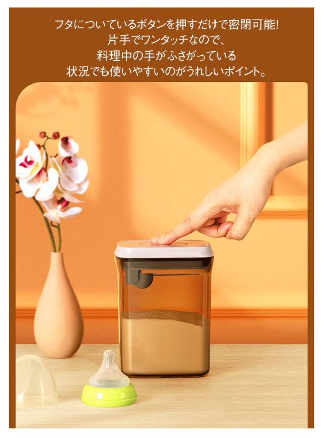 | 粉ミルクやプロテインの長期保存に最適な容器 フタについているボタンを押すだけで密閉可能!片手でワンタッチなので、料理中の手がふさがっている状況でも使いやすいのがうれしいポイント。 クリアだけでなく、茶色のデザインは遮光効果があり粉ミルクの鮮度を保てます♪ フタ部分はスプーン収納所があり、サイズ違いスプーンにも対応できます。 コンパクトなサイズ、外遊びや旅行に大変便利なアイテムです。 粉ミルクだけでなく、米やナッツなどの保存容器としてもおすすめ。 | |