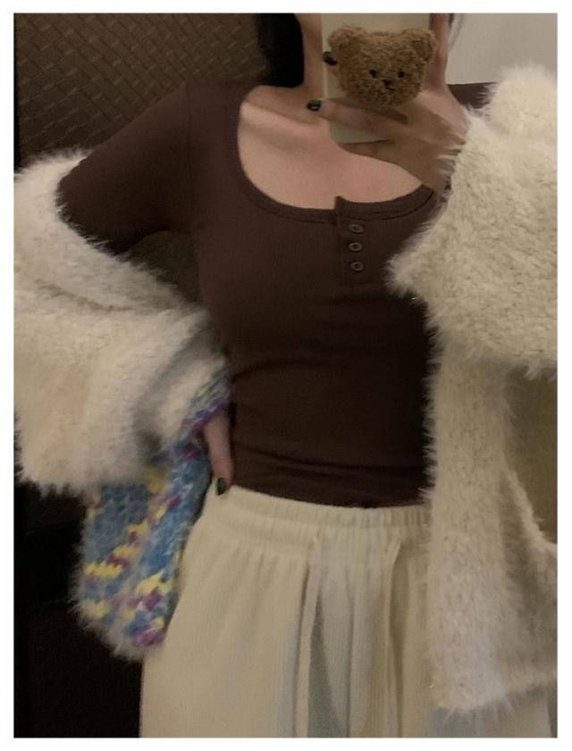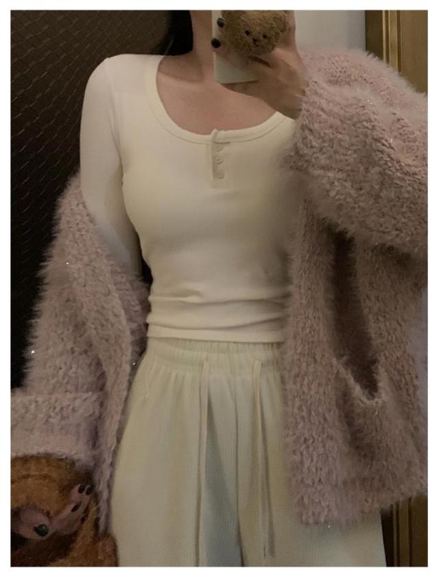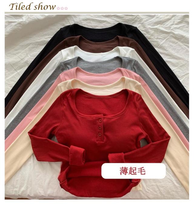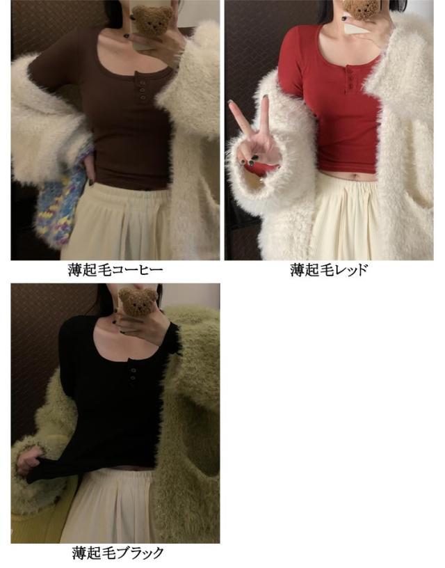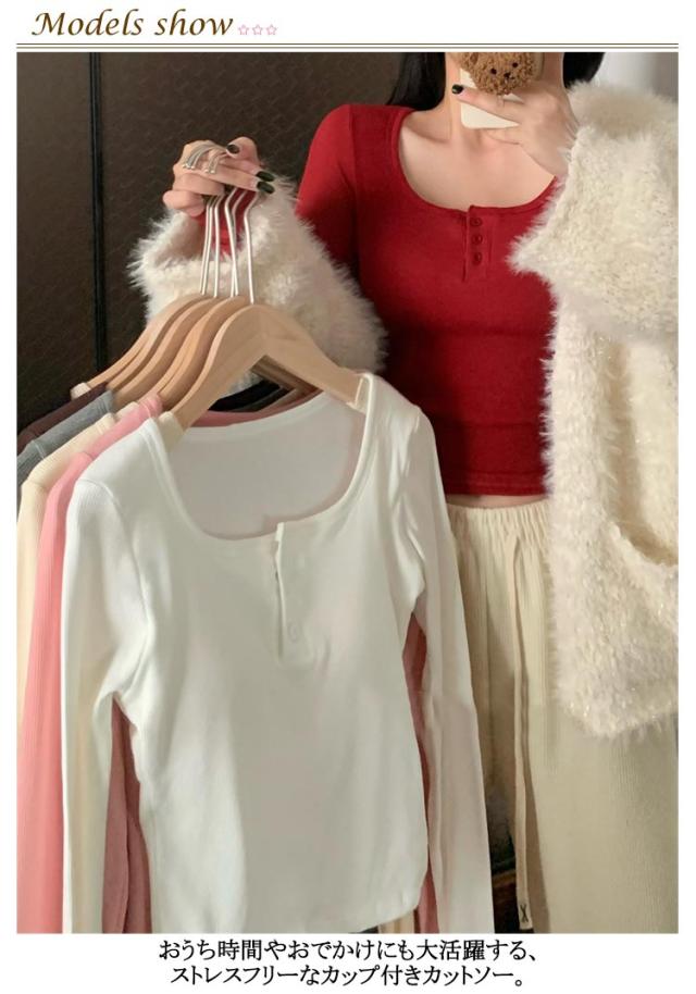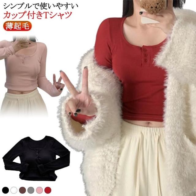 カップ付き Tシャツ ランドネック ストレッチ 長袖 前ボタン 裏起毛 ルームウェア 暖か ノンワイヤー 肌着 uネック ブラトップ 部屋着 トップス 無地 リブ レディース 下着 カップ付き ナイトウェア ジムウェア 冷え対策 保温 秋 冬