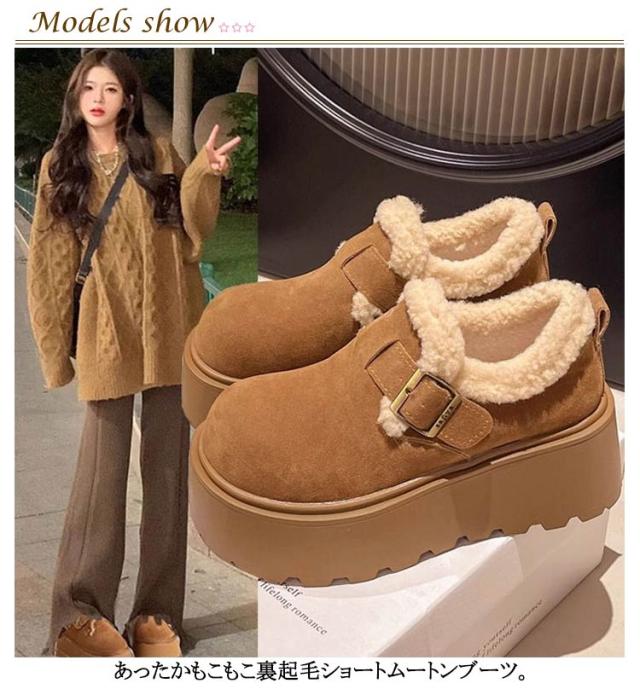 | 22.5cm〜25cm 7cm厚底 レディーススエードショートブーツ あったかもこもこ裏起毛ショートムートンブーツ 内側はつま先からボアが足を包み込み、歩き心地もとっても楽ちんの一足 しっかり凸凹の入った合成ゴムソール仕様で雪道や濡れた地面でも滑りにくくて安心 計算された適度なボリューム感、柔らかく曲がる靴底で快適な履き心地 | |