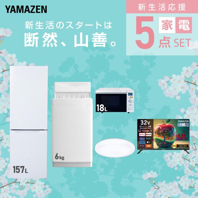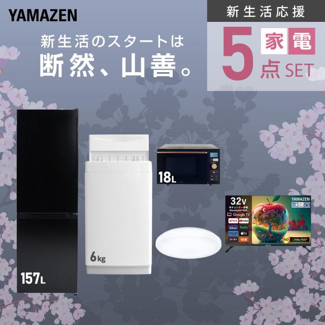 新生活家電セット 5点セット 一人暮らし (6kg洗濯機 157L冷蔵庫 オーブンレンジ シーリングライト スマートテレビ 32型) ひとり暮らし 単身赴任新 学生 入学 おすすめ 山善 YAMAZEN【送料無料】