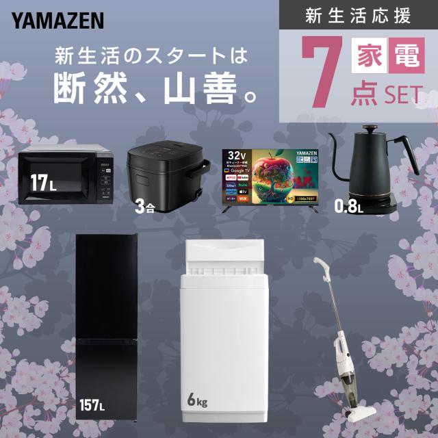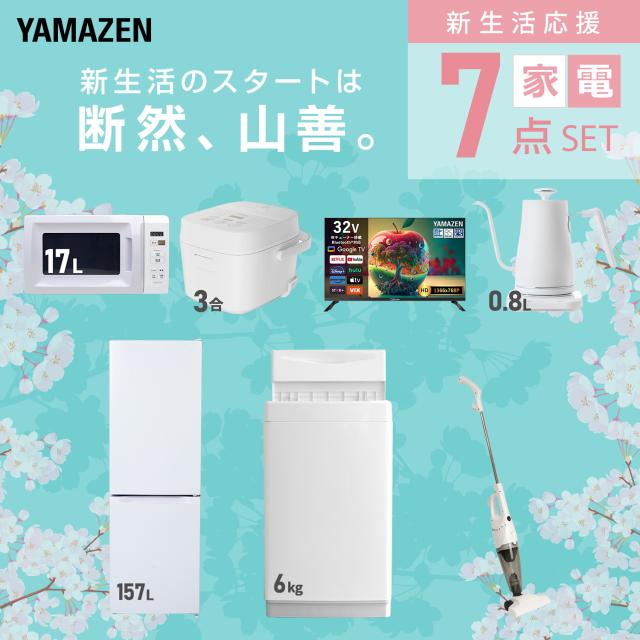新生活家電セット 7点セット 一人暮らし (6kg洗濯機 157L冷蔵庫 電子レンジ 炊飯器 スマートテレビ 32型 温調ケトル スティッククリーナー) ひとり暮らし 単身赴任新 学生 入学 おすすめ 山善 YAMAZEN【送料無料】