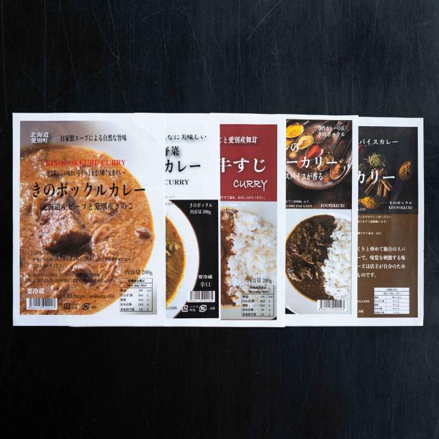 【数量・内容】きのポックルカレー(北海道産ビーフと愛別産きのこ)200g、ベジタブルカリー(舞茸と色々野菜)200g、煮込み牛すじカレー200g、薬膳ポークカリー180g、舞茸とマトンのスパイシーカリー180g