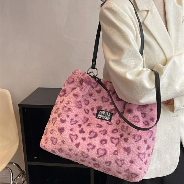 柔らかい、パフィー、フワフワ、ぬいぐるみ、ファジー 1個 ピンクのヒョウ柄ぬいぐるみトートバッグ、メタリックリングデコレーション、大容量、女性、女子大生、OL向け、秋冬アイテム
