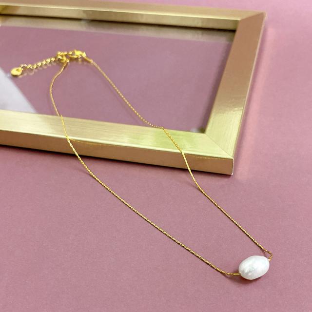ぷっくりした小ぶりなパールと首元に馴染むスリムなゴールドチェーンが上品見えさせる、一粒淡水パールネックレス。