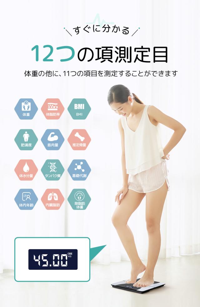 ・日本語専用アプリ・自動データ同期。体重の測定を含め12種類の健康項目が測定できます。