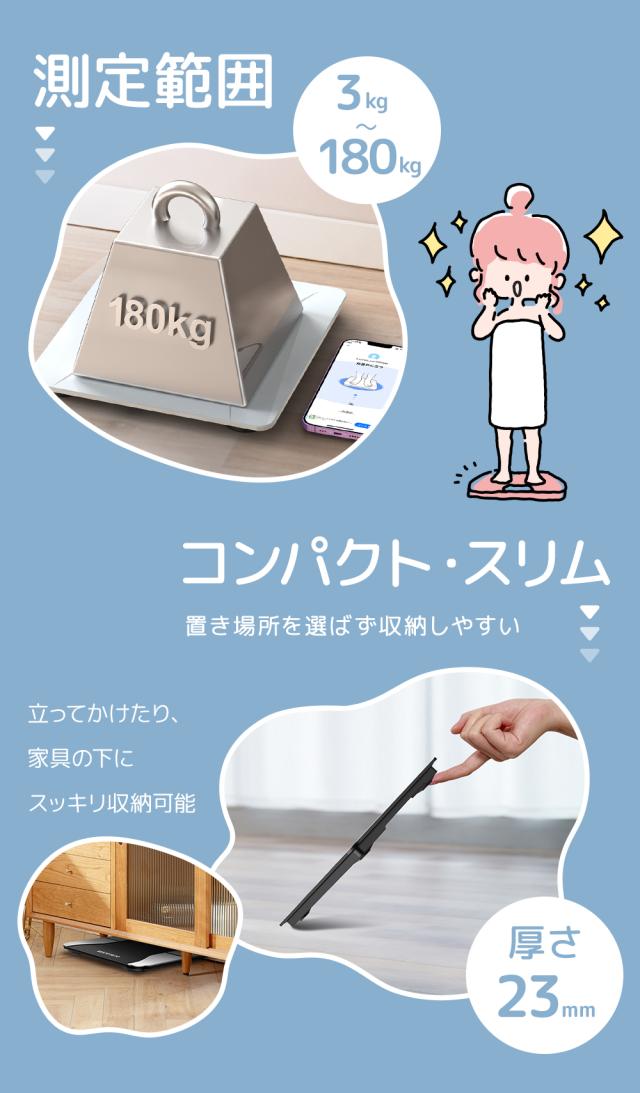 ・人間工学設計・収納便利。体重計の厚さは僅か23mm。超薄型なためベッドの下にしまったり、本のように空いたスペースに立て掛けても大丈夫です。