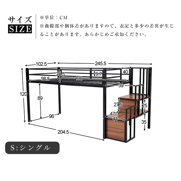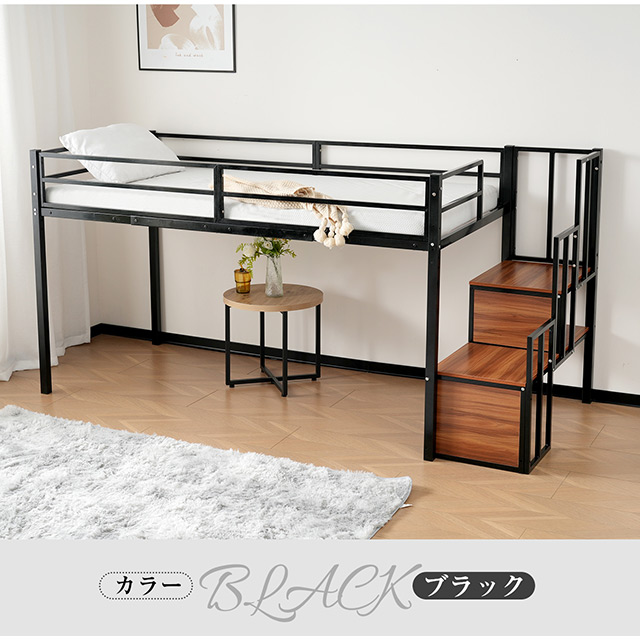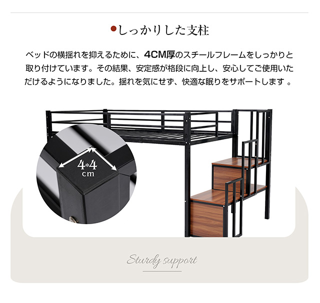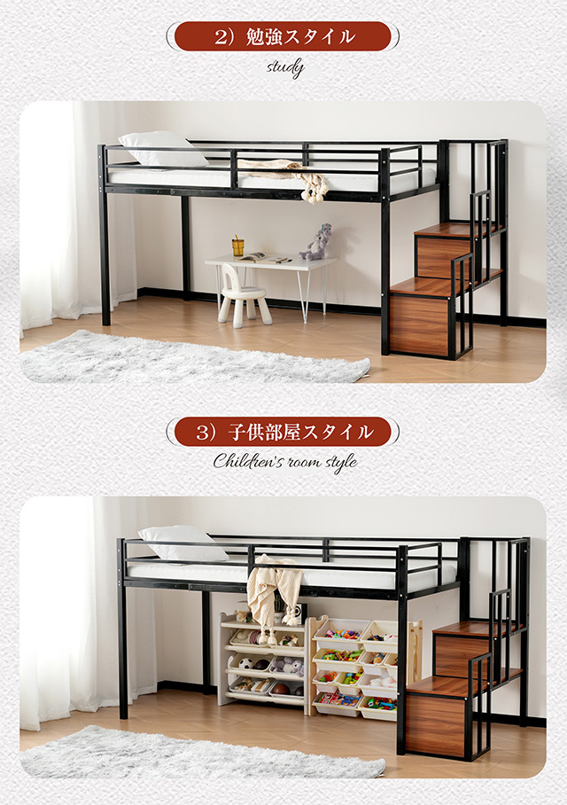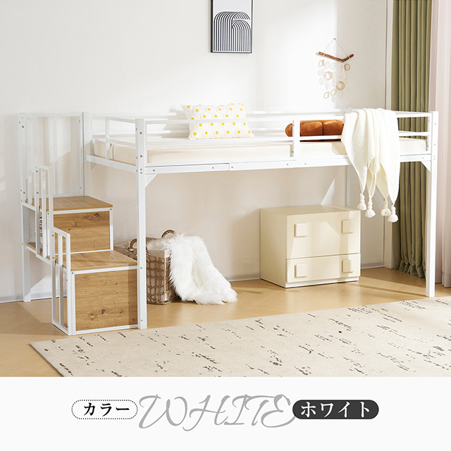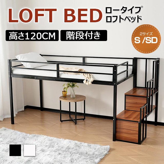 「クーポン配布中」「2サイズ:Sシングル/SDセミダブル」ロータイプ ロフトベッド 高さ120cm 階段付き パイプベッド 耐震ベッド シングルベッド 子供ベッド 二段ベッド 収納付き 子供部屋 二段ベッド パイプベッド フレーム スチール 北欧風 新生活応援