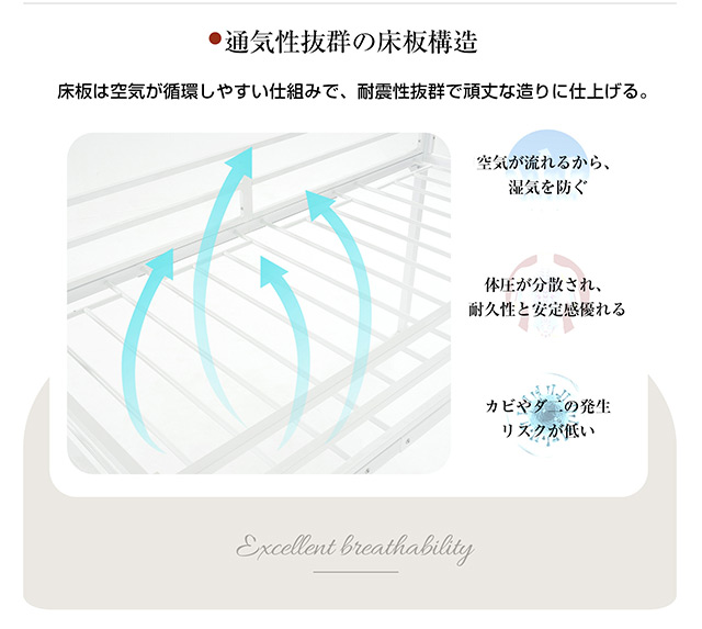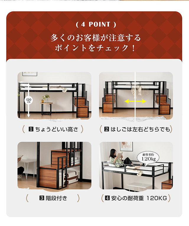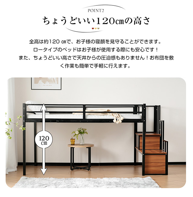【ちょうどいい120?の高さ】全高は約120 ?で、お子様の寝顔を見守ることができます。ロータイプのベッドはお子様が使用する際にも安心です!また、ちょうどいい高さで天井からの圧迫感もありません!お布団を敷く作業も簡単で手軽に行えます。