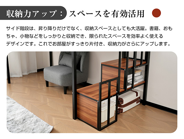 【収納力アップ:スペースを有効活用 】サイド階段は、昇り降りだけでなく、収納スペースとしても大活躍。書籍、おもちゃ、小物などをしっかりと収納でき、限られたスペースを効率よく使えるデザインです。これでお部屋がすっきり片付き、収納力がさらにアップします。