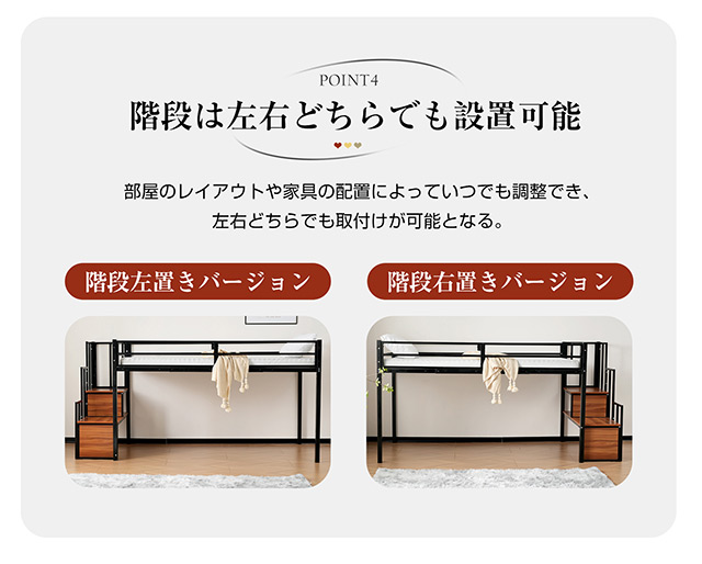 【階段は左右どちらでも設置可能】部屋のレイアウトや家具の配置によっていつでも調整でき、左右どちらでも取付けが可能となる。
