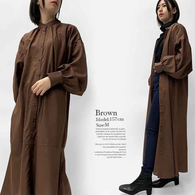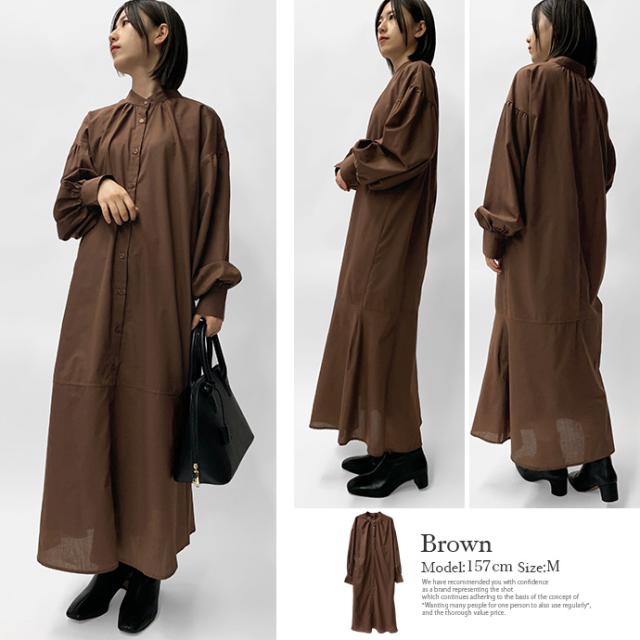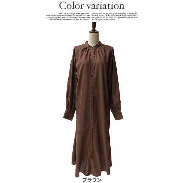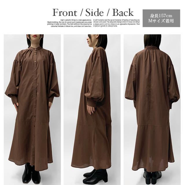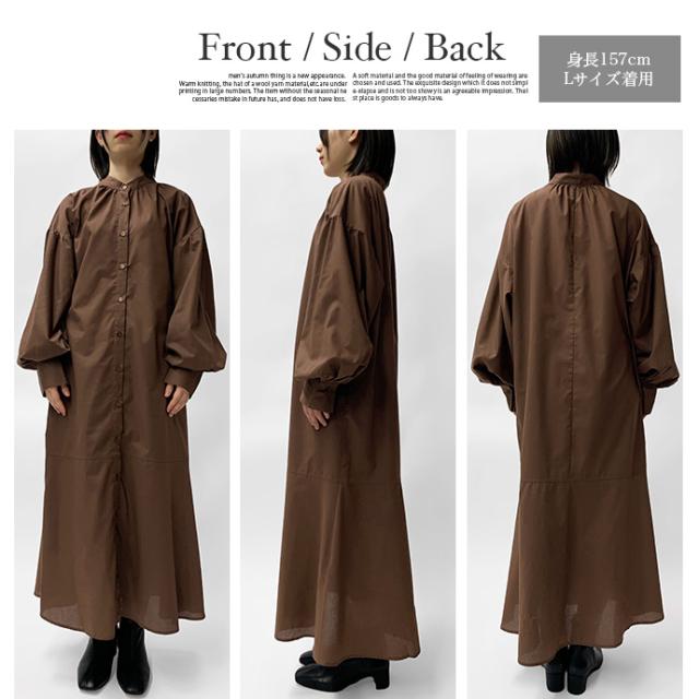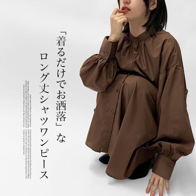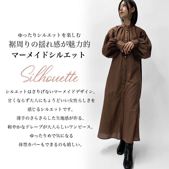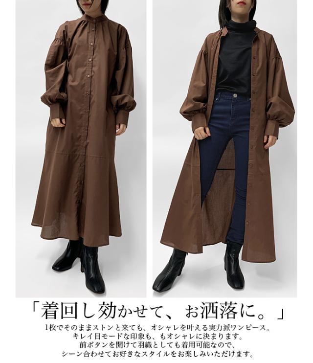 ワンピース シャツワンピース ロング丈 ロングシャツ 羽織り 長袖 マーメイド ぽわん袖 パフスリーブ バンドカラー シャツワンピ ゆったり 体型カバー 無地 前開き 前ボタン フロントボタン レディース 送料無料