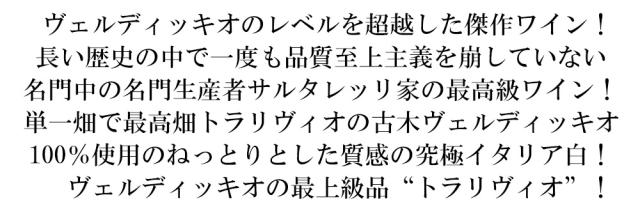ヴェルディッキオのレベルを超越した傑作ワイン! 長い歴史の中で一度も品質至上主義を崩していない 名門中の名門生産者サルタレッリ家の最高級ワイン! 単一畑で最高畑トラリヴィオの古木ヴェルディッキオ 100%使用のねっとりとした質感の究極イタリア白! ヴェルディッキオの最上級品“トラリヴィオ”!