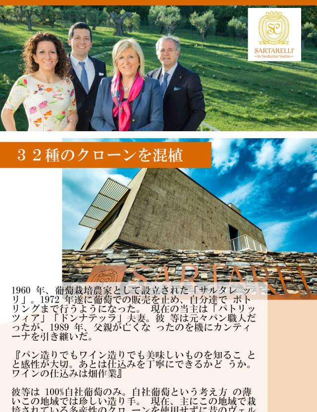 【50ha以上の広大な畑を持ち、内30ha以上がベースのヴェルディッキオ・クラシコに充てられる。一家族が経営するカンティーナとしては広大な畑だが、長い歴史の中で一度も品質至上主義を崩していない優良生産者。カステリ・ディ・イエジを引っ張ってきたのは間違いなくこのカンティーナである。サルタレッリはパトリッツィオ・キアリーニ氏と夫人のドナテッラが経営しており、エノロゴはアルベルト・マッツォーニ。パトリッツィオは1990年まではパン職人であった。義父が1970年に14haの葡萄畑を購入し、少しずつワイン造りにのめり込んでいったが、1989年に義父が亡くなってしまう。パトリッツィオはこれを引き継ぎ一気に品質を高めていった。