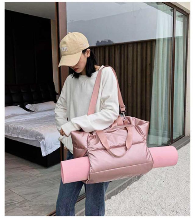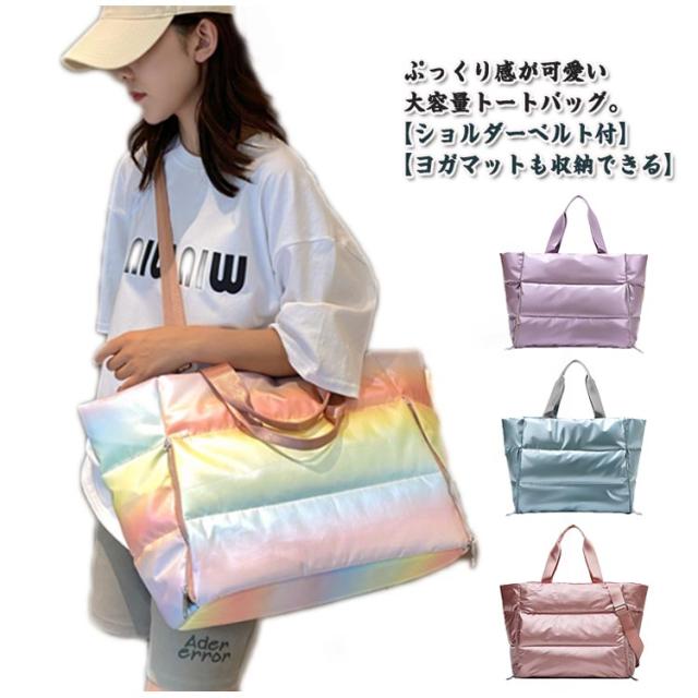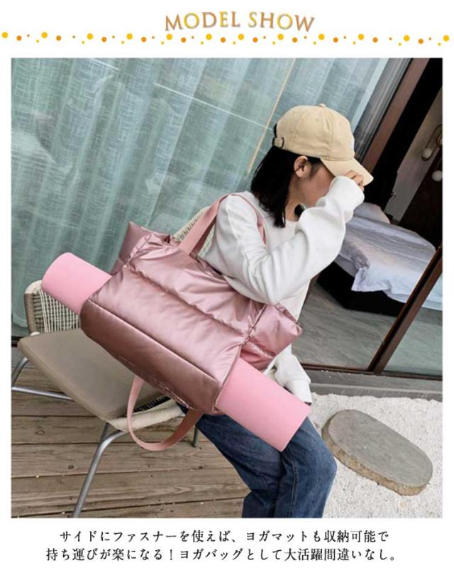 | ぷっくり感が可愛い大容量トートバッグ。【ショルダーベルト付】【ヨガマットも収納できる】 サイドにファスナーを使えば、ヨガマットも収納可能で持ち運びが楽になる!ヨガバッグとして大活躍間違いなし。 持ち歩きたいものをまとめて入れる大きめ軽量バッグ。普段使いやスポーツ、小旅行にも使える万能トートバッグ。水筒や折り畳み傘、タオルや洋服など大きめの荷物まで入って使い方は自由自在! さっと楽々取り出せるインナーポケット。すぐ出したいイヤホンやリップなど小さな小物を入れられて便利! 気分に合わせてチェンジ!2WAYバッグ。肩に掛けやすく取り外し可能なベルトがセット。ショルダータイプ&ハンドバッグの2通り楽しめる♪ 軽量で使いやすいキルティング生地。撥水性なので汚れても拭き取るだけ。耐摩耗性もあり傷が付きにくい◎ 開け口はファスナーで安心して使える◎ 付属のベルトは調節可能で便利! | |