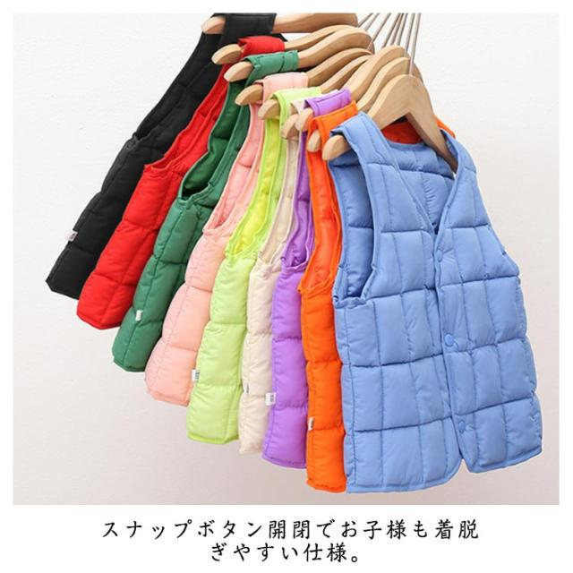 | かわいいキャンディカラーのキッズベスト。 軽くて暖かい中綿タイプで秋冬の保温防寒にぴったり。 スナップボタン開閉でお子様も着脱ぎやすい仕様。 カラーもサイズも選べて、兄弟姉妹揃いのもおすすめ。 | |