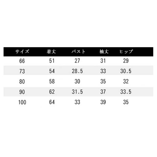 | サイズについての説明 | 【66】着丈51cm 袖丈31cm バスト27*2cm ヒップ29*2cm 【73】着丈54cm 袖丈33cm バスト28.5*2cm ヒップ30.5*2cm 【80】着丈58cm 袖丈35cm バスト30*2cm ヒップ32*2cm 【90】着丈62cm 袖丈37cm バスト31.5*2cm ヒップ33.5*2cm 【100】着丈64cm 袖丈39cm バスト33*2cm ヒップ35*2cm ※測定方法によって誤差が生じますので、予めご了承下さい。 |