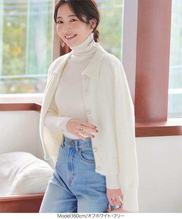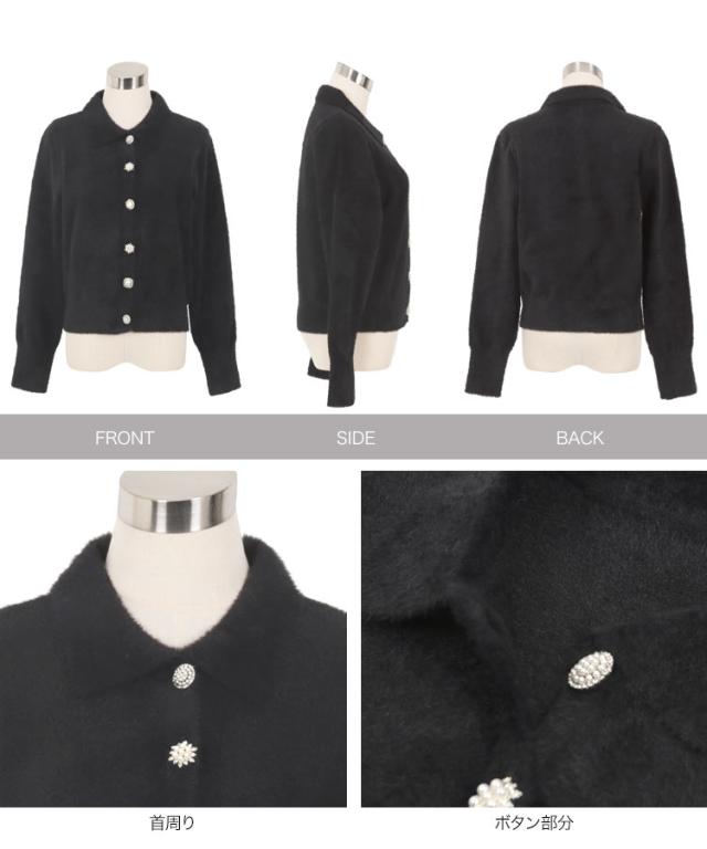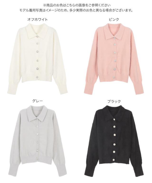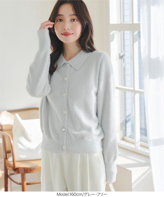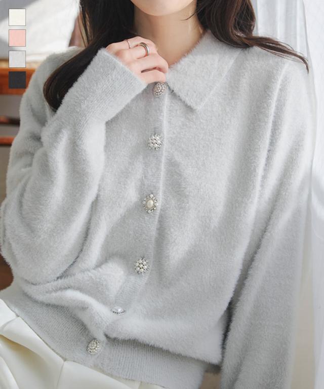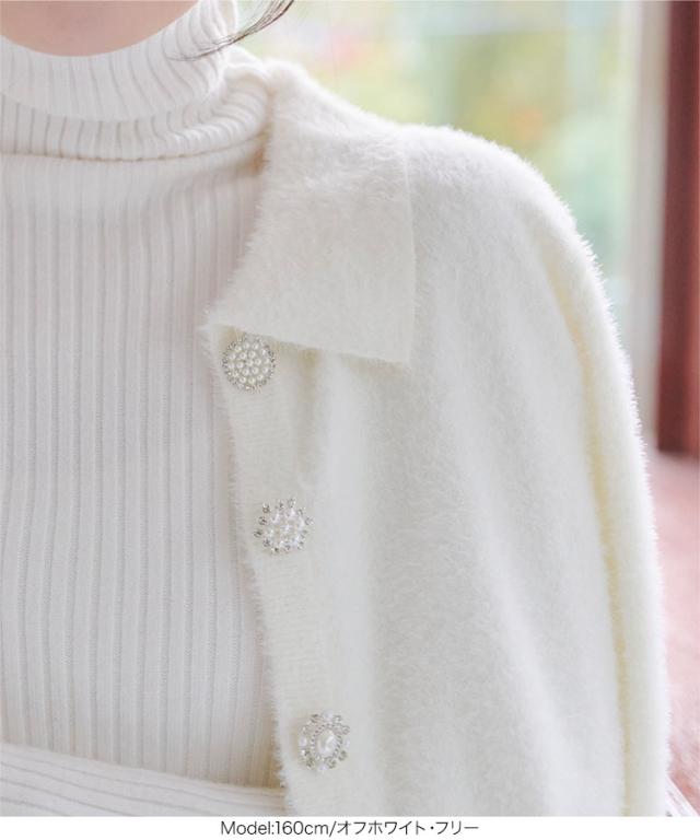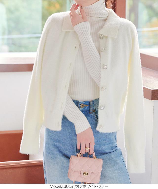 襟付きビジューボタンシャギーニットカーディガン N1108 入荷済 レディース 20代 30代 40代 アウター トップス 長袖 ニット セーター シャギー ファー フェザー カーディガン ニットジャケット ポロ ポロニット ビジュー 羽織り 白 オフ