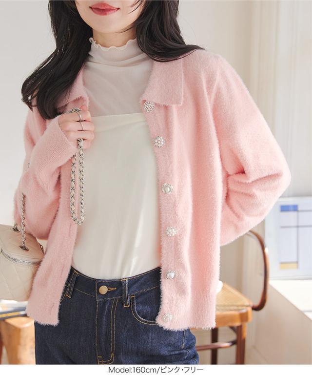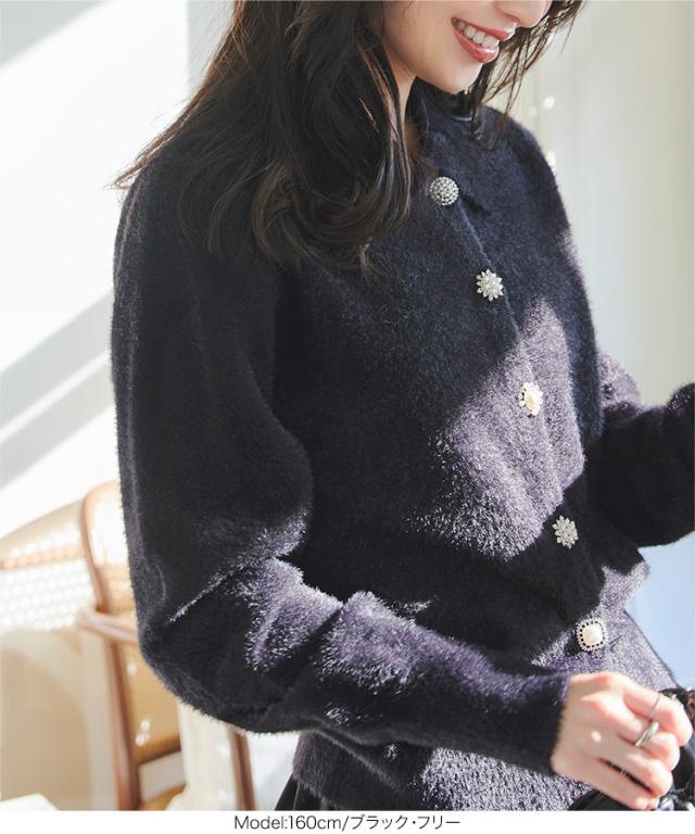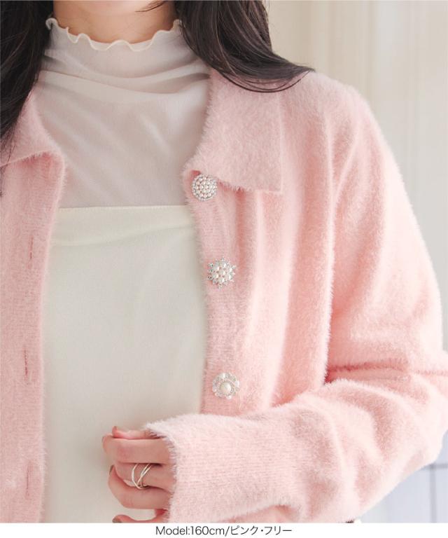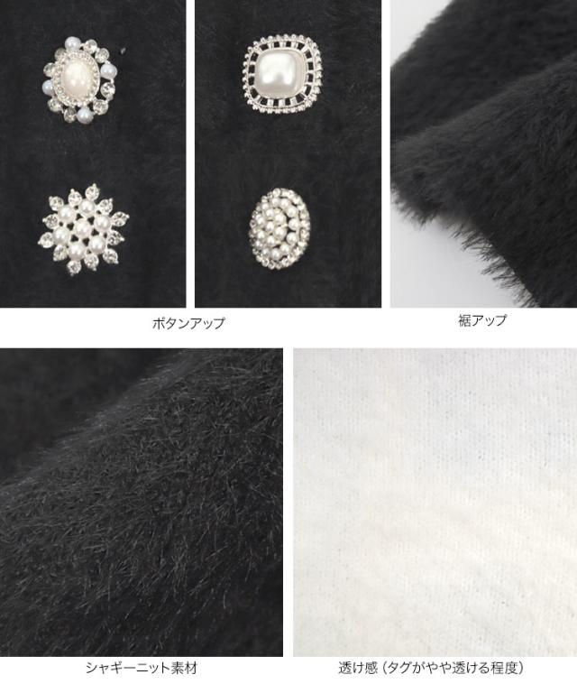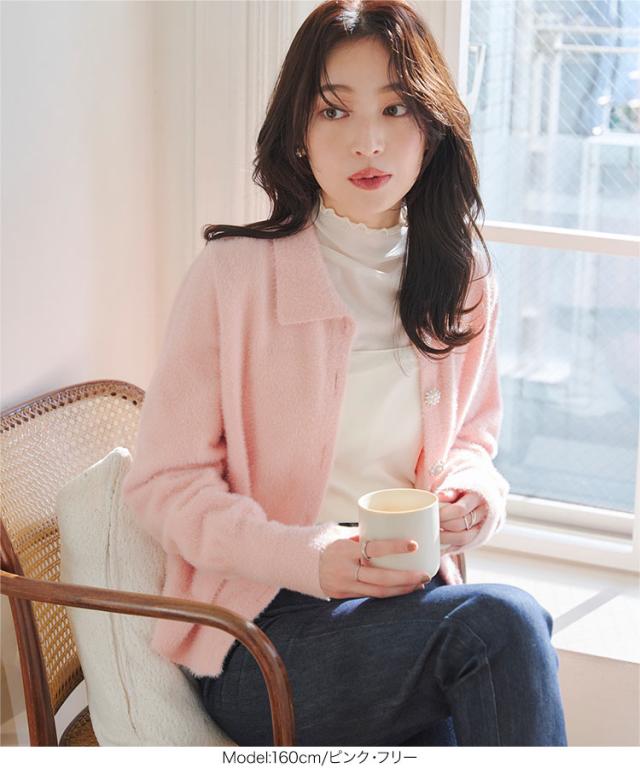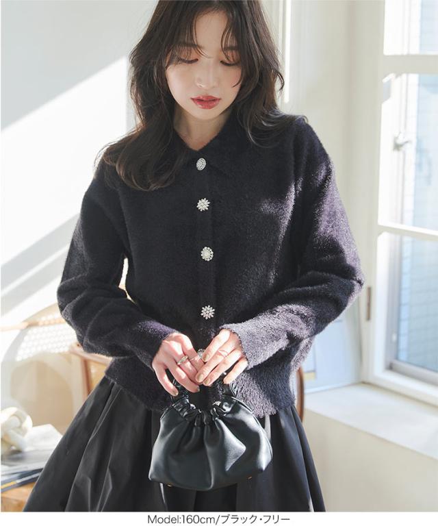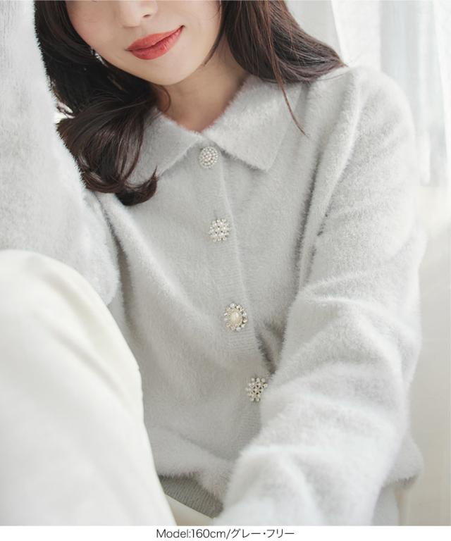 襟付きビジューボタンシャギーニットカーディガン N1108 入荷済 レディース 20代 30代 40代 アウター トップス 長袖 ニット セーター シャギー ファー フェザー カーディガン ニットジャケット ポロ ポロニット ビジュー 羽織り 白 オフ