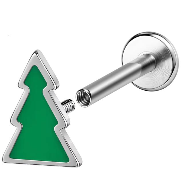 緑色グリーンのクリスマスツリーのモミの木を逆ネジタイプの16ゲージのシャフトにセットしたステンレス製のラブレット型ボディピアス。