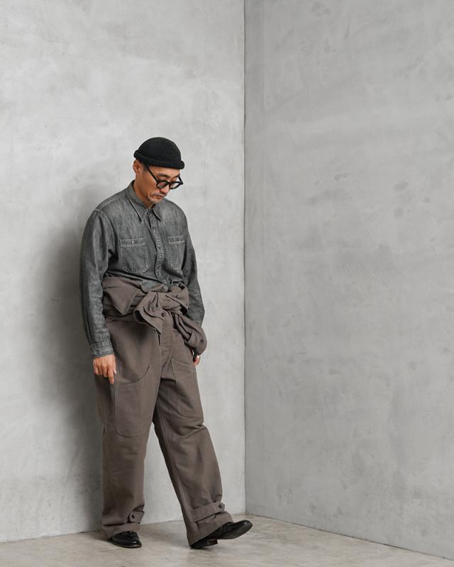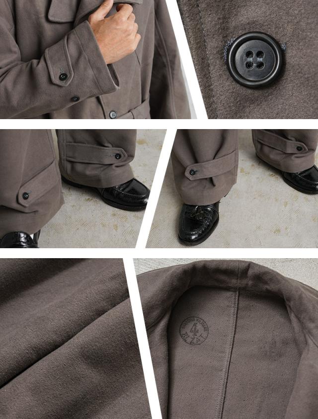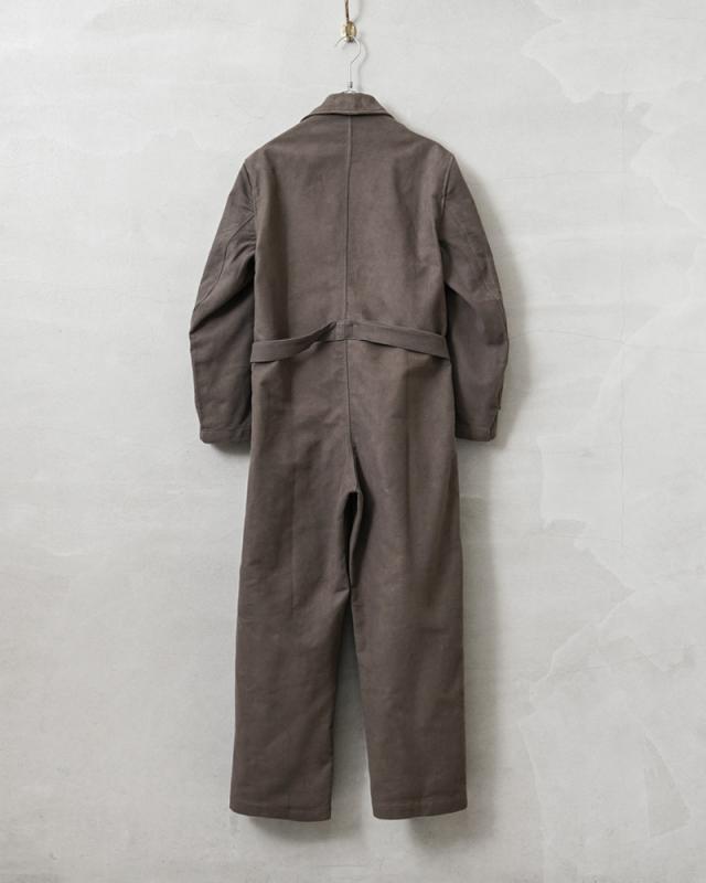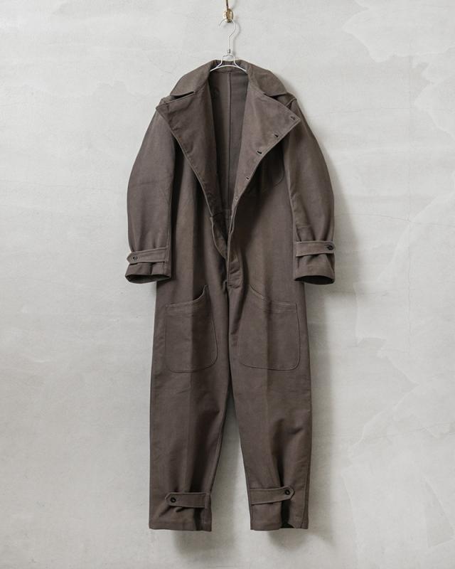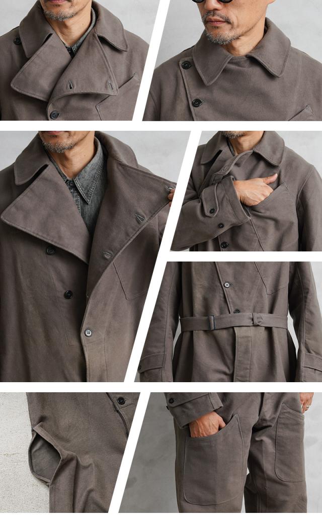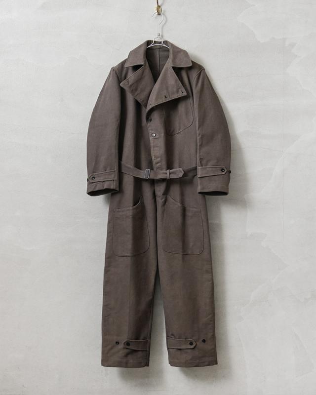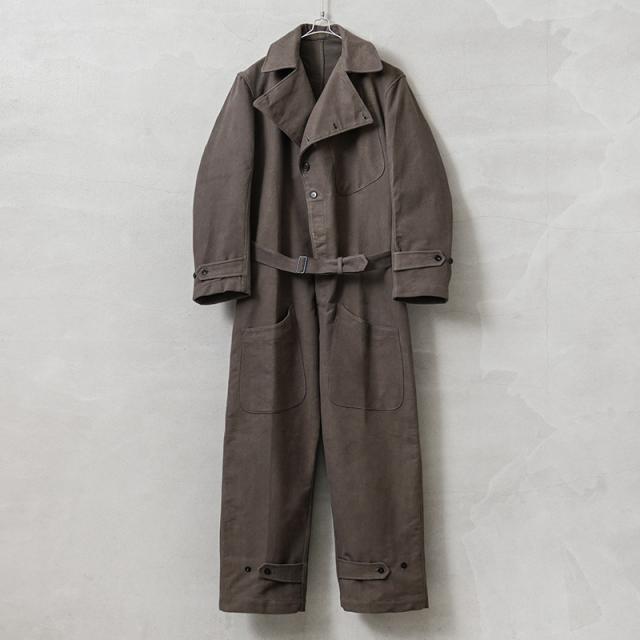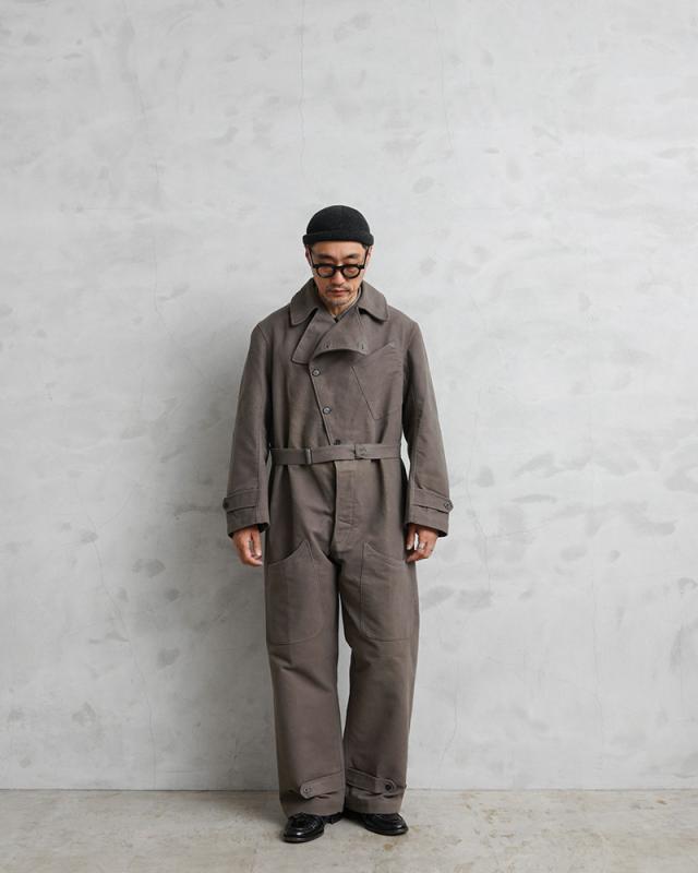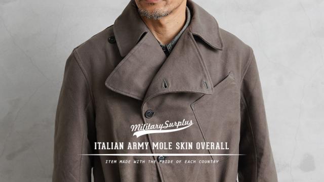 イタリア軍放出の厚手の起毛生地を使用したカバーオールが登場しました。見た目にも温かく高級感も感じられる、柔らかい起毛のモールスキン素材。ダブル風のフロント部分が特徴的で他とは一線を隠すデザイン性の高さも魅力です。左胸に1つ、両前腿にパッチポケットがあり、ウエストは角カン付きのベルトで締めることが可能。ウエストサイド部分には貫通ポケットが備わっており、オーバーパンツのように内側にアクセスできる便利な仕様になっています。充分な可動域が取れるルーズなフィット感。袖口や裾はボタンと平ベルトで調節可能で、ブーツインなどする際に役立ち、冷気を防ぐので防寒性も高まります。