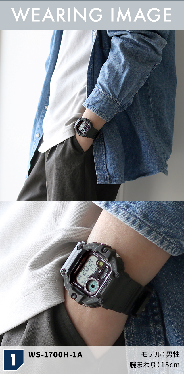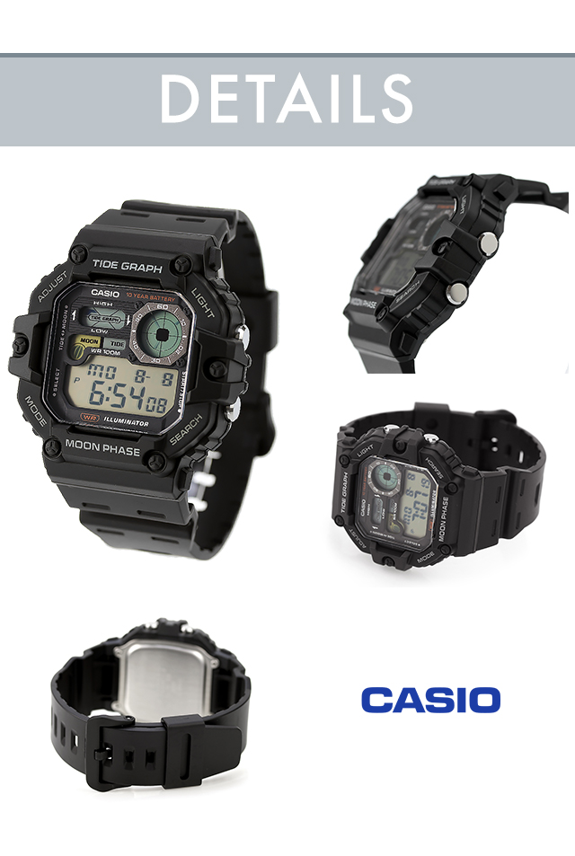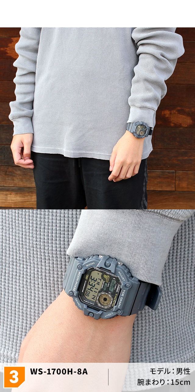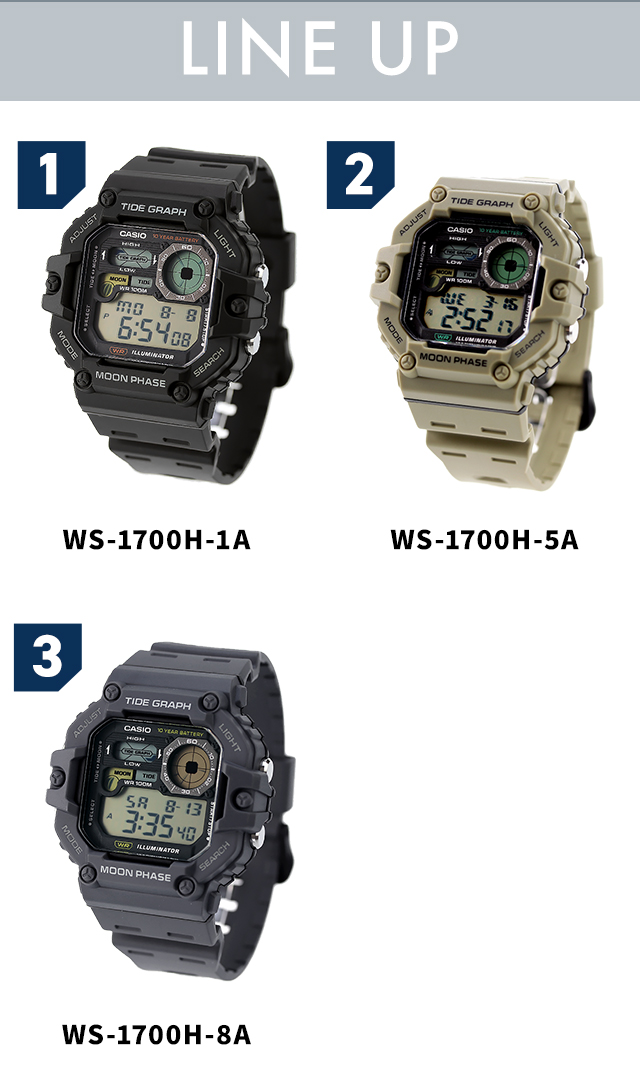 7年保証キャンペーン カシオ CASIO スタンダード チプカシ クォーツ 電池式 海外モデル クォーツ 電池式 メンズ 腕時計 WS-1700H STANDARD デジタル ブラック ベージュ グレー 選べるモデル ◆海好きは注目!マリンスポーツをする方に嬉しい大型ケースと便利な機能を備えたデジタルウオッチです。堅牢なケース形状や多窓フェイスなど、メカニカルな歯車を思わせる重厚感のあるデザインです。クールなガジェットの外観からインスピレーションを得た LCDを備えたこの時計は、必要な情報をはっきりと見やすく読みやすい形で提供します。スタイルと同様に機能も充実しており、タイドグラフ、ムーンデータ、最大100メートルの耐水性により、最もアクティブな日に必要なものを提供します。 WS-1700H-1AVDF WS-1700H-5AVDF WS-1700H-8AVDF 日本未発売モデル