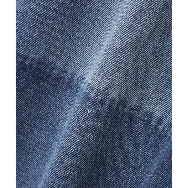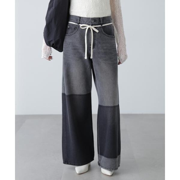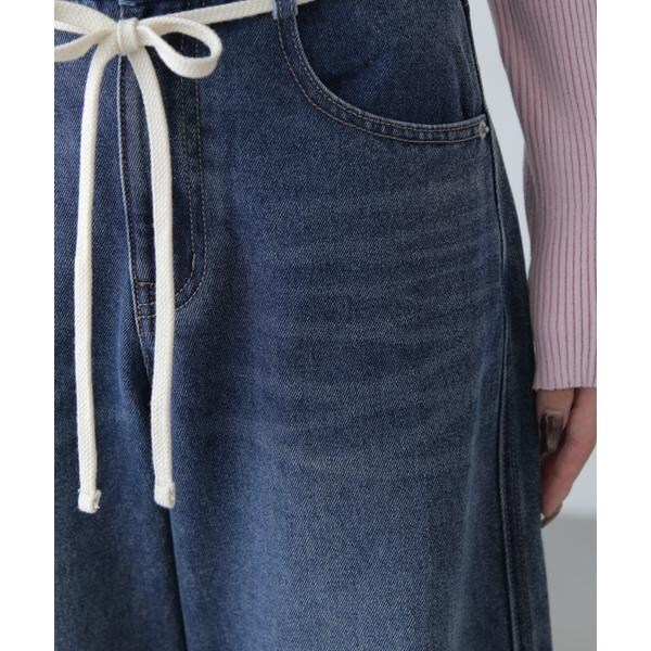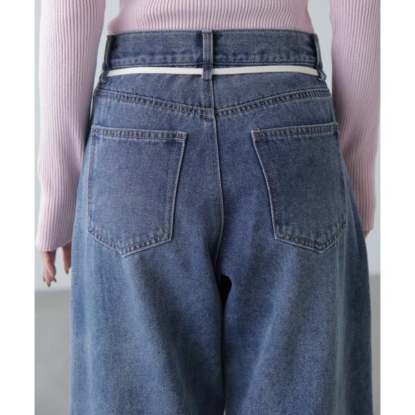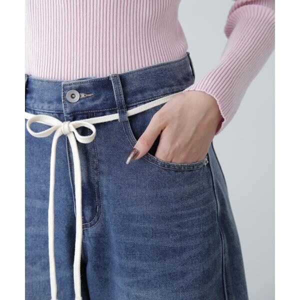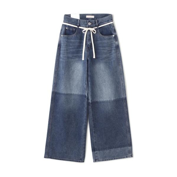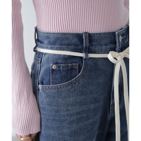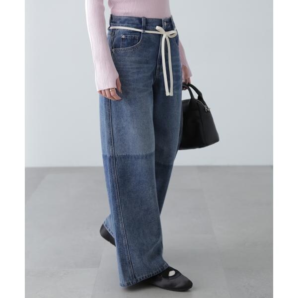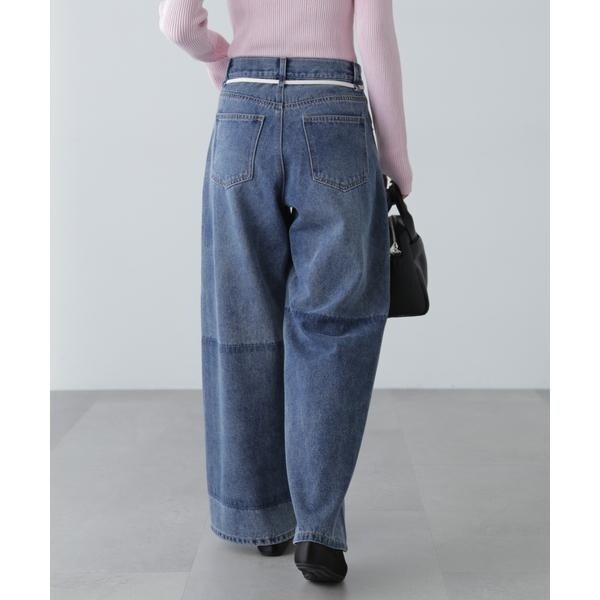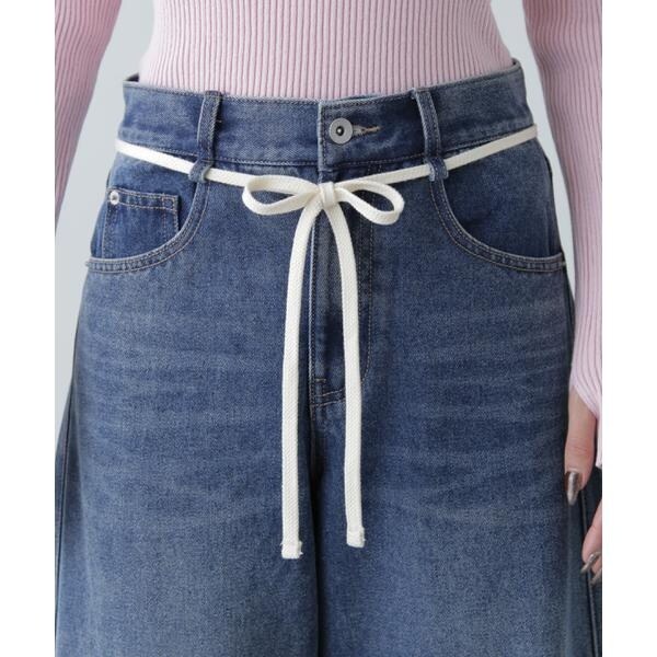 〔fabric&design〕リメイクのようなフェイドタッチの濃淡のコントラストで、雰囲気あるトレンドライクなヴィンテージデニムです。程よくルーズなワイドストレートシルエットでリラックス感があり、ウエストの生成りスピンドルリボンでポイントを付けています。加工の風合いやディテールにこだわり、旬なスタイリングでカジュアルにこなれた雰囲気を楽しめます。〔styling〕ウエストのリボンがポイントなので、トップスをインしての着こなしがおススメ。こなれた雰囲気に仕上げたので、合わせるトップスやシューズなどで、きれいめからカジュアルまで幅広くお使いいただけます。