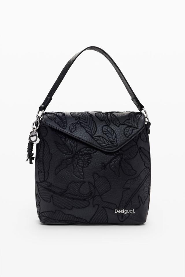 花の浮き彫りが施されたミディアムサイズのフェイクレザーバッグ。交換可能なハンドル付き。
