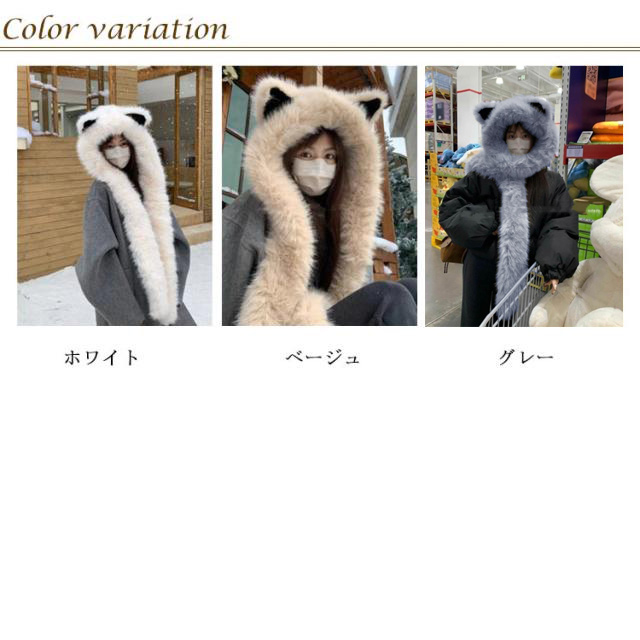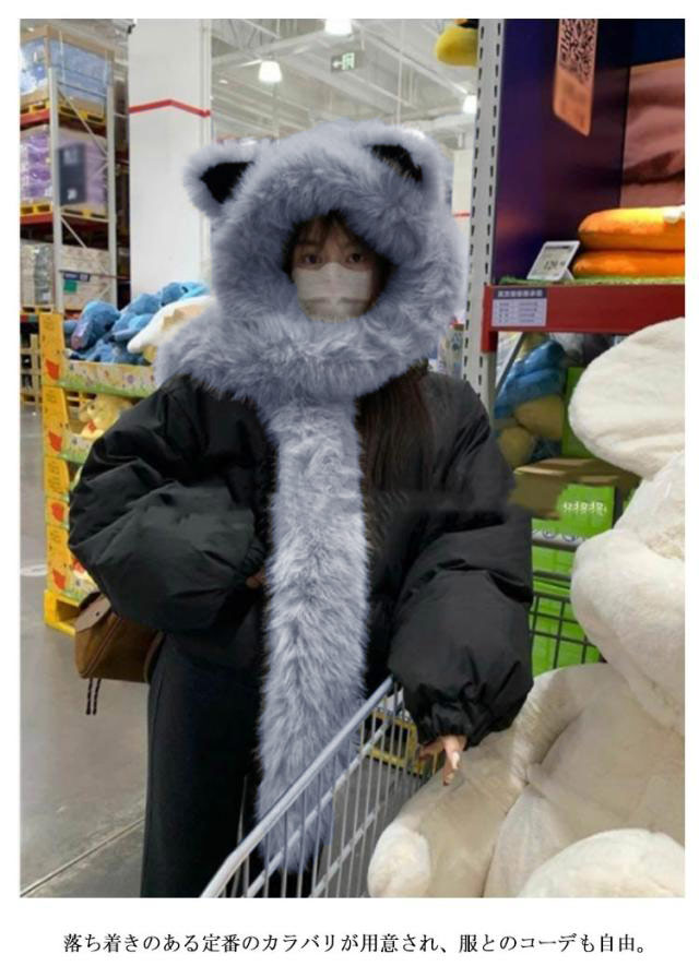 | 冬ファッションに必ず大活躍、レディース用の防寒アイテムです。 フードとマフラーが一体となってるデザインで首、頭、耳全般的に守ってくれる。 肌触り抜群のふわふわフェイクファー素材は寒い季節に優しくて暖かい守りをもたらす。 静電気を防止する特殊な加工を施しています。 機能性とデザイン性を兼ね備えて、秋冬コーデのアクセントになれる。 落ち着きのある定番のカラバリが用意され、服とのコーデも自由。 | |