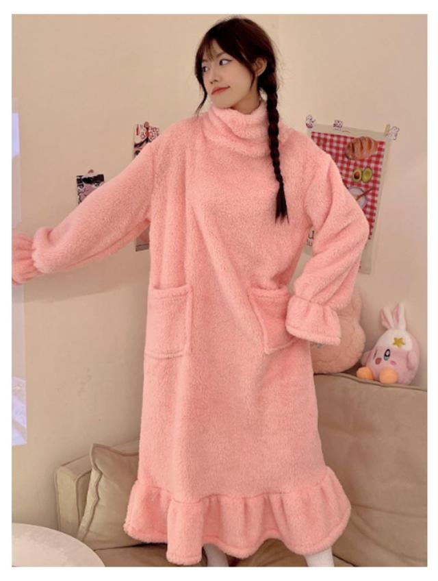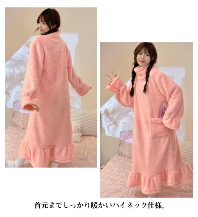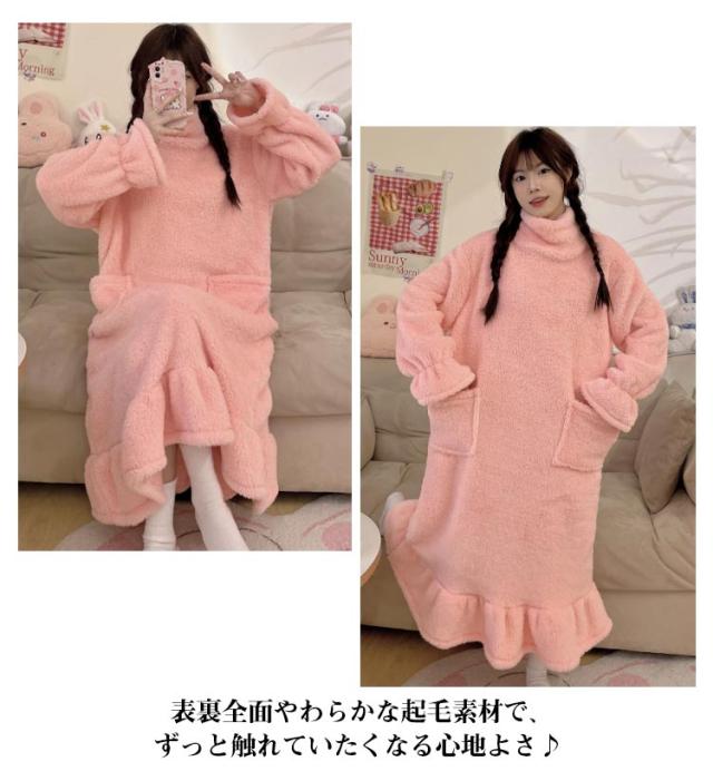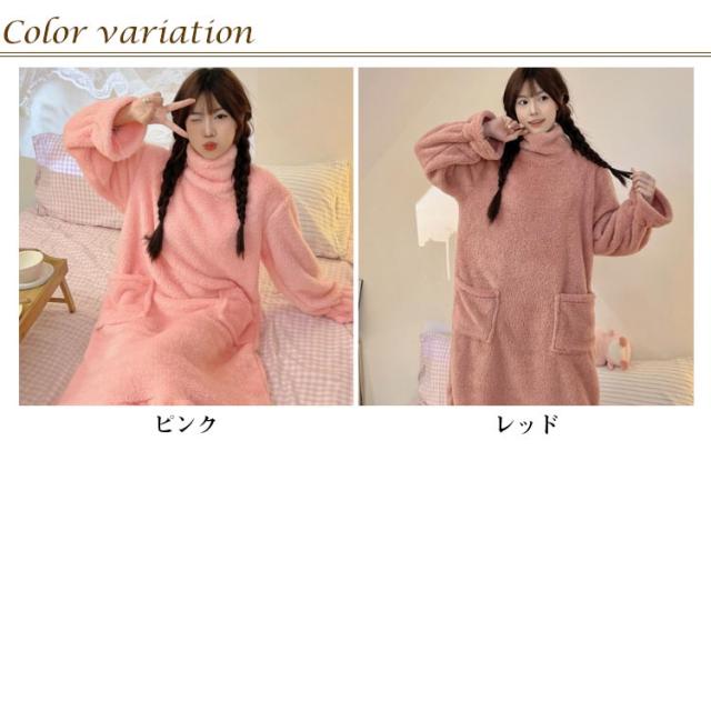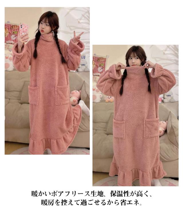 長袖 レディース ハイネック 部屋着 軽量 冬 パジャマ あったか ルームウェア ポケット付き ロング丈 マキシ丈 起毛 暖かい もこもこ ふわふわ 柔らか おしゃれ 可愛い シンプル ストレッチ 着る毛布 あったか ナイトウェア タートルネック 首 裏ボア 裏起毛