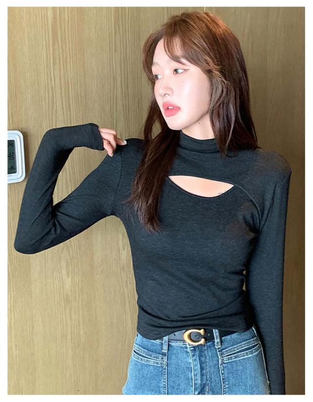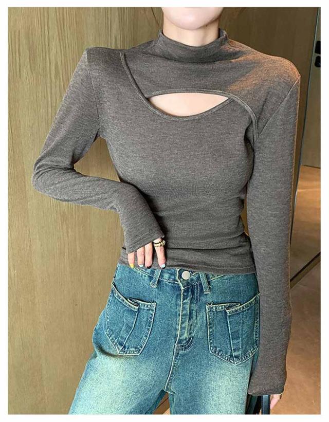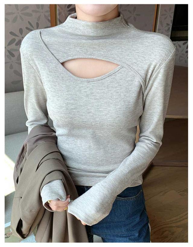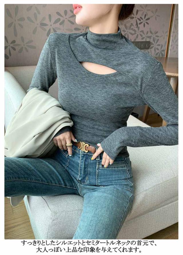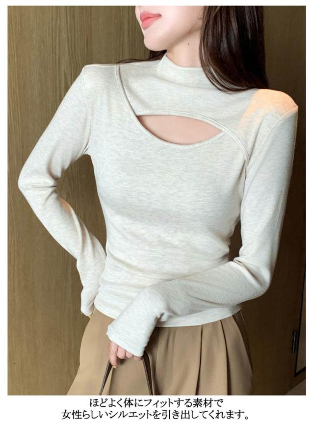 フロントオープン 送料無料 インナー レディース 胸元 カットソー 長袖 胸開き Tシャツ タートルネック 長袖トップス カットアウト プルオーバー タイト 送料無料 バスト セクシー シンプル