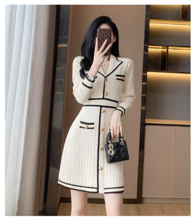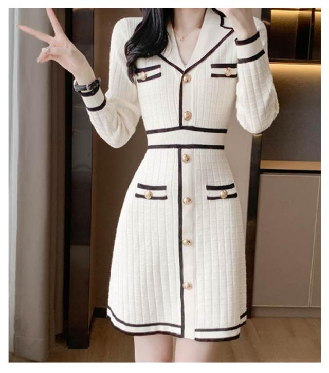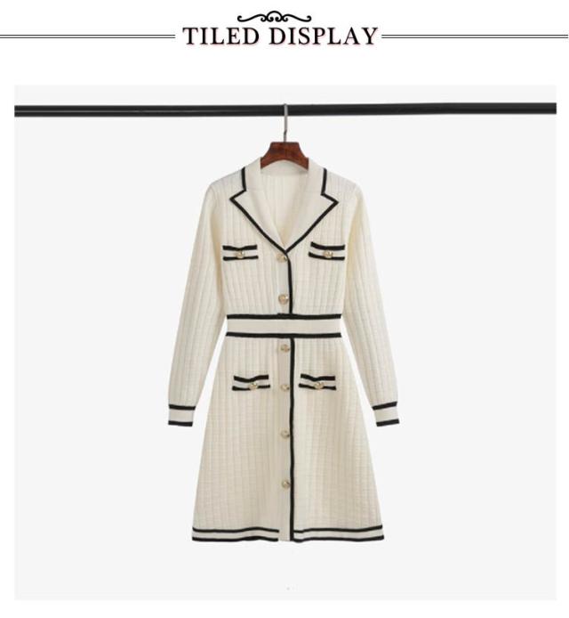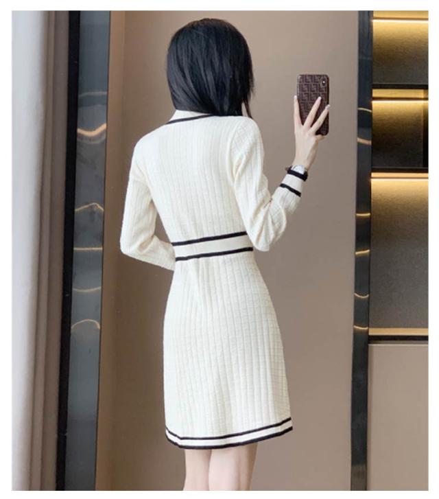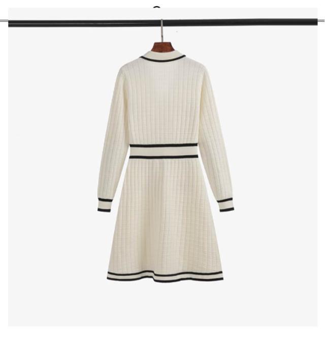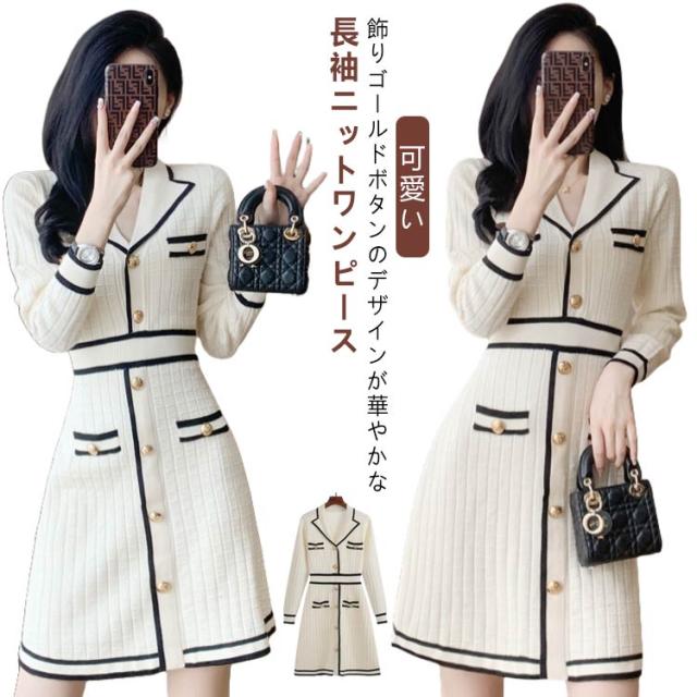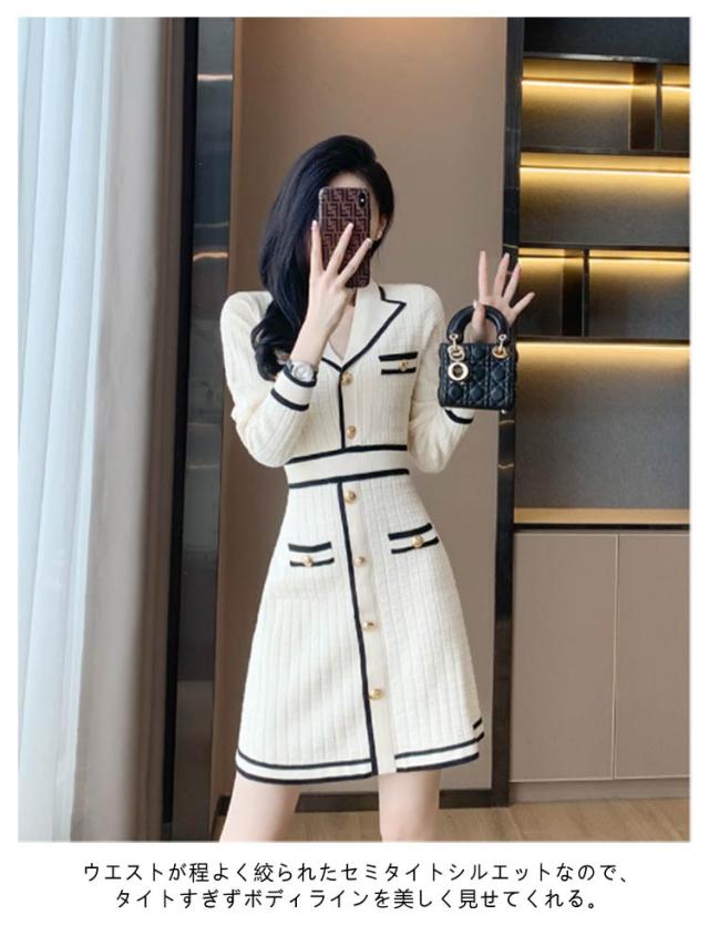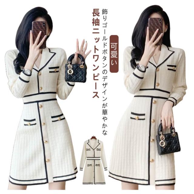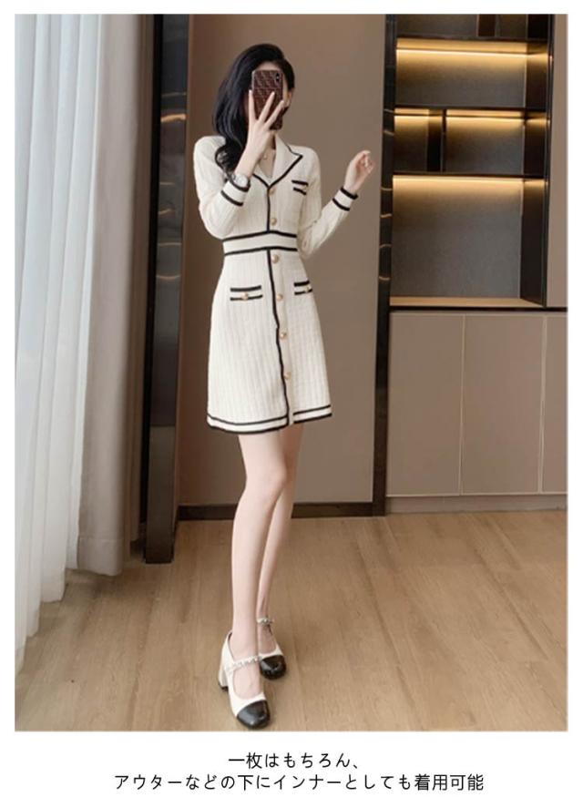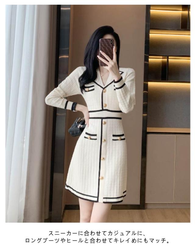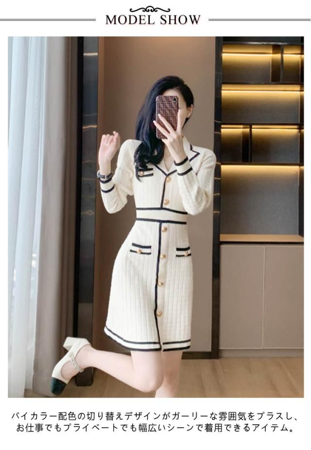 レディース フレアワンピース 襟付き Aライン ニットワンピース ワンピース バイカラー配色 リブ 長袖 ニット ミニ 送料無料 フレア ワンピース ショート丈 チュニックワンピース エレガント オシャレ