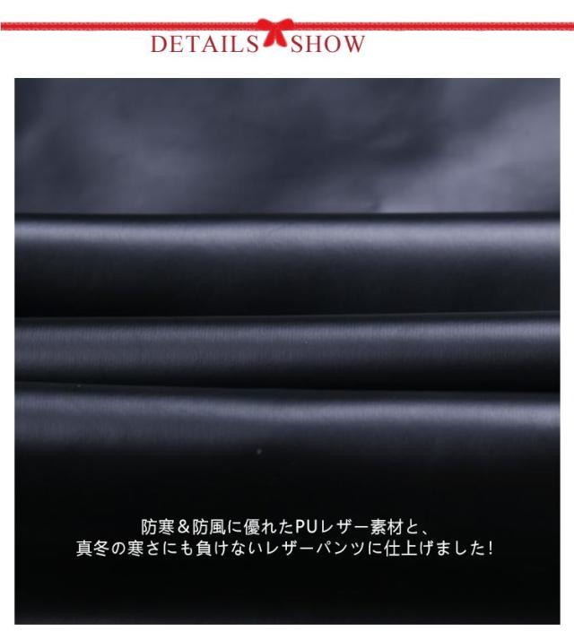 | 革パンツ 柔軟性・履き心地よい 防寒&防風に優れたPUレザー素材と、真冬の寒さにも負けないレザーパンツに仕上げました! ワイルドさと色気を醸し出すスマートなPUレザーパンツ。 全体に程よい光沢感があるPUレザーを使用し、艶やかにコーディネートを彩る。 両サイドとバックにはポケットを配置。 | |