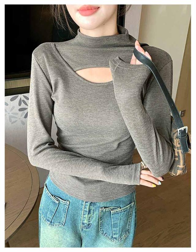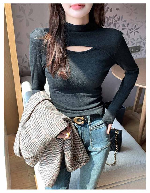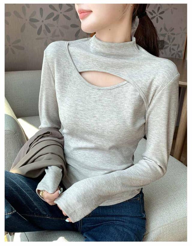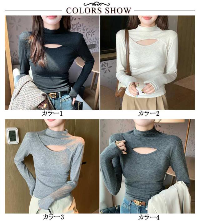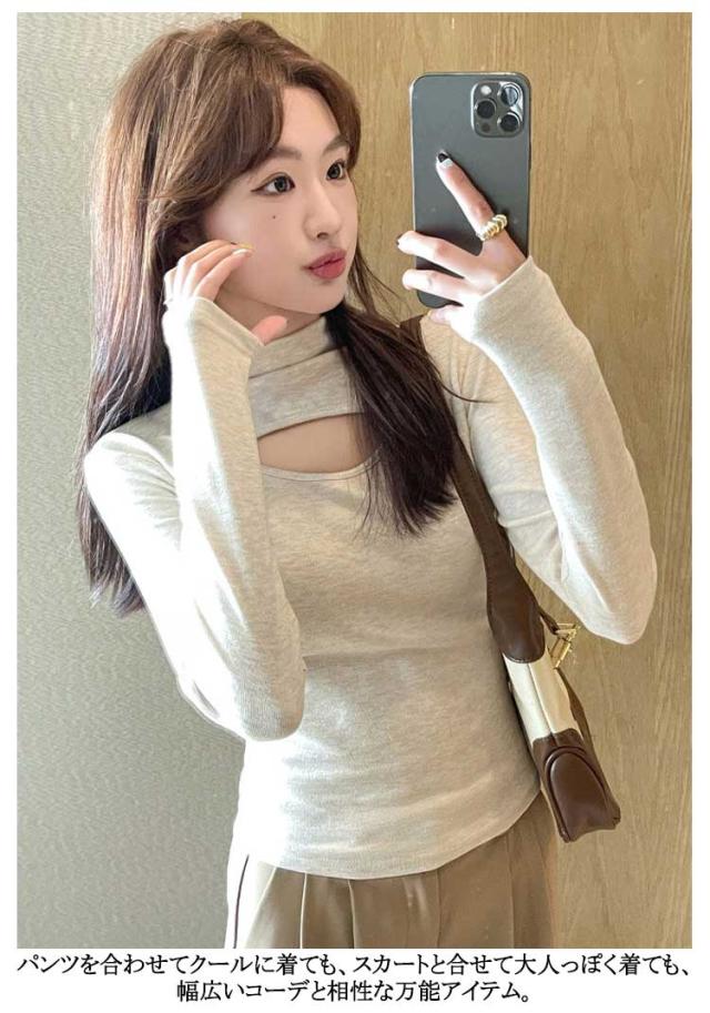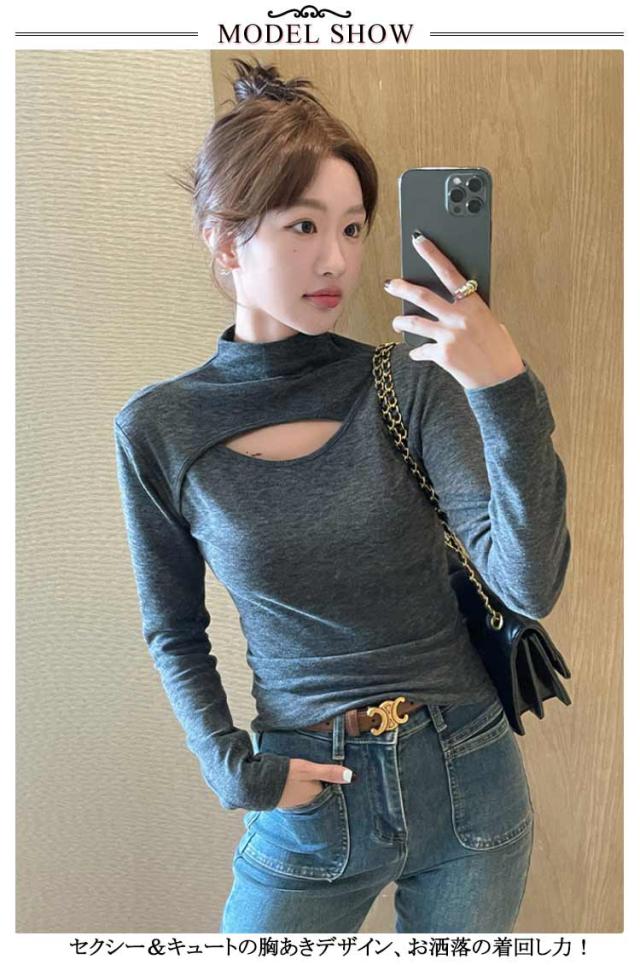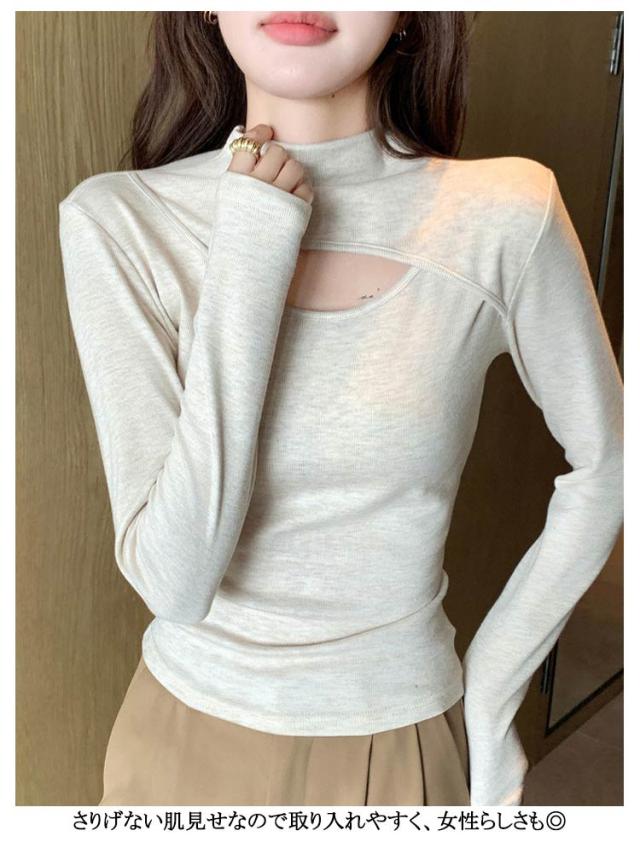 胸元 長袖トップス レディース インナー 長袖 フロントオープン カットアウト 胸開き ハイネック タートルネック カットソー Tシャツ タイト プルオーバー 送料無料 バスト セクシー シンプル