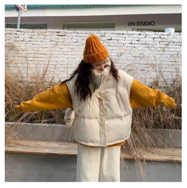 | 抜群の暖かさとふんわり軽くソフトな着心地が特徴のダウン風中綿ベスト。 軽量で包み込まれるような着用感がおしゃれと“暖かさ”をどちらも叶えるポイント。 ゆるっとラフに着用できるオーバーサイズ。 程よい襟立ちで首周りをガードしつつ嬉しい小顔効果も◎ ゆったりめなサイズ感なので厚手のインナーの上に着ていただいてもダウン特有の着ぶくれ感がないのが嬉しい。 大きめのフロントポケットは手を入れるのも小物収納にも便利、軽くて暖かな着心地、長時間着ても肩凝らずにらくちん! シンプルなデザインでコーディネートしやすく、スカートにもパンツにも、ワンピースの上から羽織ってもおしゃれ。 | |