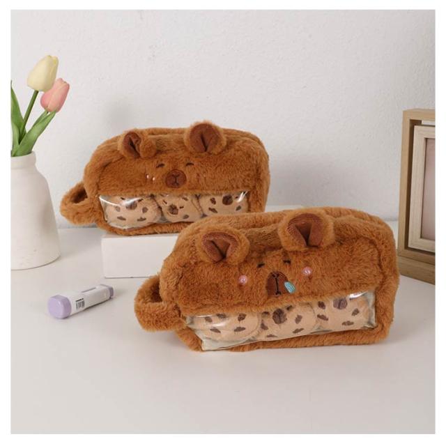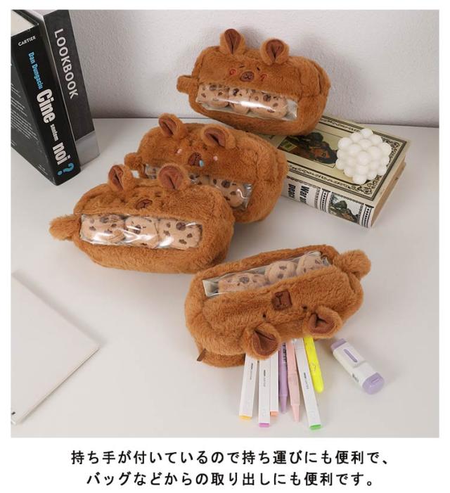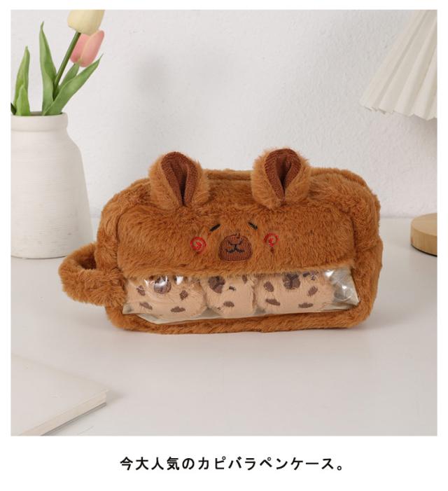 ペンケース 痛バ カピバラ 筆箱 可愛い ふわふわ もこもこ 推し筆箱 推し 缶バッジ入れ 透明窓付き ペンケース 筆入れ 面白い 表情 顔 耳付き 取っ手 大容量 個性的 小学生 中学生 高校生 女の子 男の子 プレゼント 贈り物 ギフト 誕生日